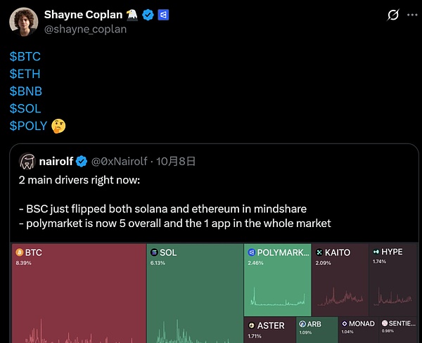 This is also likely a combination of the latest $2 billion in financing, and Polymarket CEO Shayne Coplan also posted a tweet with the POLY symbol on October 9, which may become a key variable in the competition between the two giants.