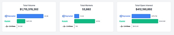 As of October 10, 2025, a comparison of Polymarket and Kalshi data shows that, in addition to the total trading volume of Polymarket being $1.3 billion vs $410 million, which is a significant lead, Polymarket has fallen behind Kalshi in terms of the number of markets (10,200 vs 43,500) and open interest (US$170 million vs US$240 million).