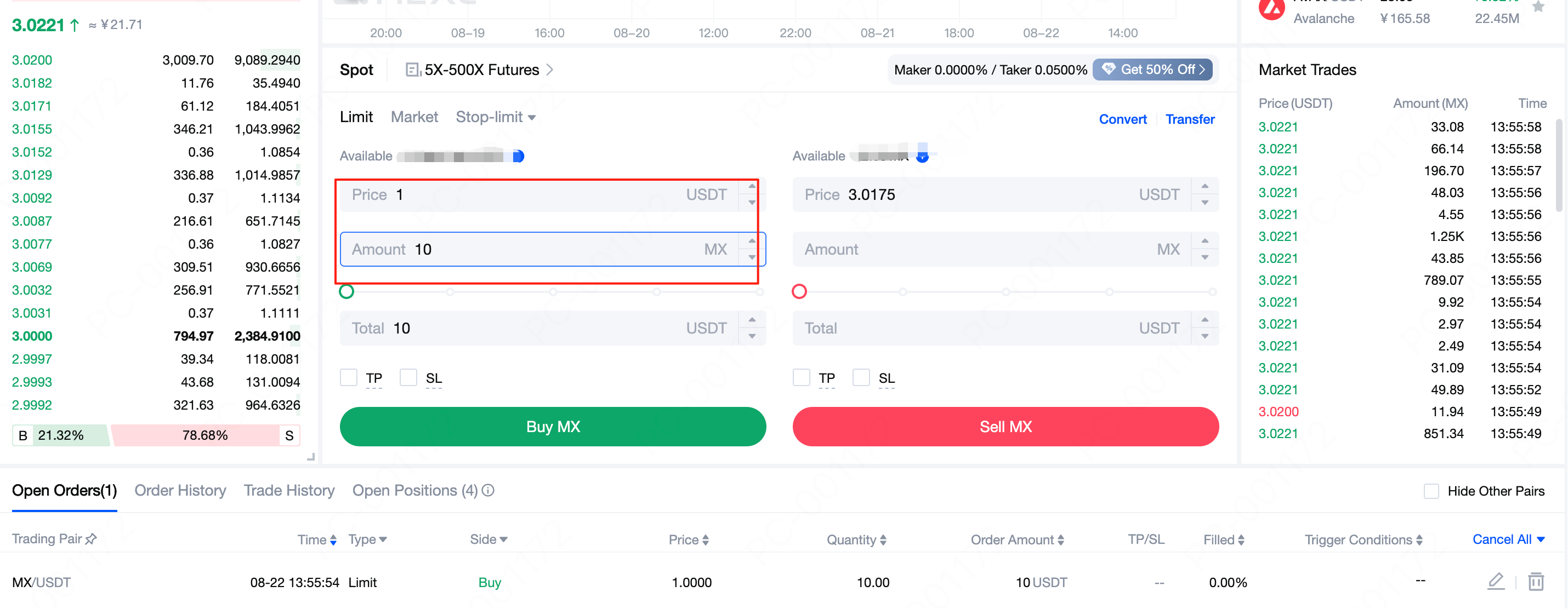 7) Uma vez que o preço de mercado atingir o seu preço definido (ou melhor), sua ordem será executada. Após a execução, você verá seus tokens MX na seção Posições abertas.