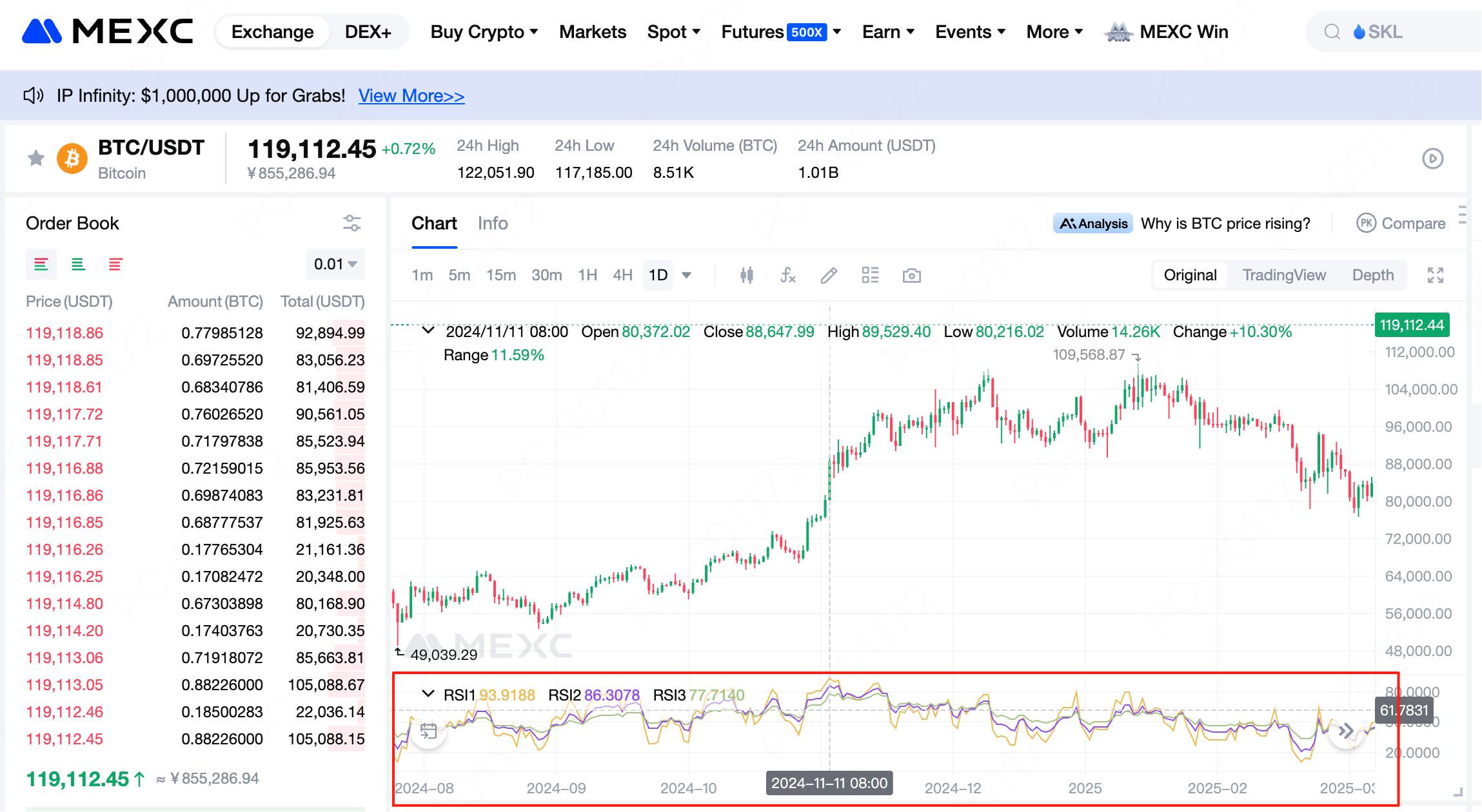 Exemplo: O RSI oscila dentro da faixa de 0 a 100. Um valor mais alto indica forte impulso de alta, enquanto um valor mais baixo sugere domínio da pressão de venda. Por exemplo, em 11 de novembro de 2024, o RSI do BTC ultrapassou o limite superior, sinalizando uma condição de sobrecompra, ou seja, uma possível oportunidade de venda a descoberto.