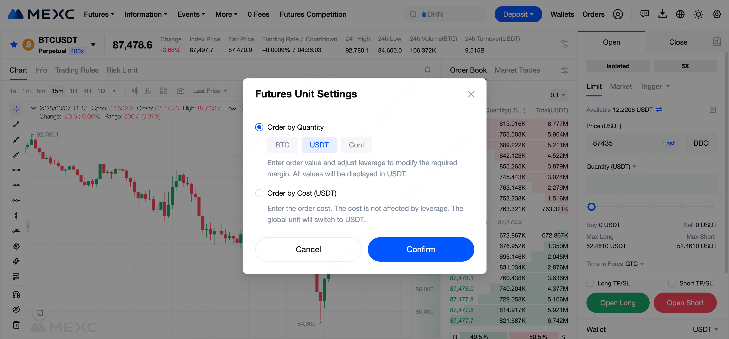 Quando você define a unidade do contrato como USDT, em vez de quantidade ou cont., na negociação de Futuros com margem em USDT, a quantidade liquidada exibida no Histórico de posições pode diferir da sua quantidade de abertura.