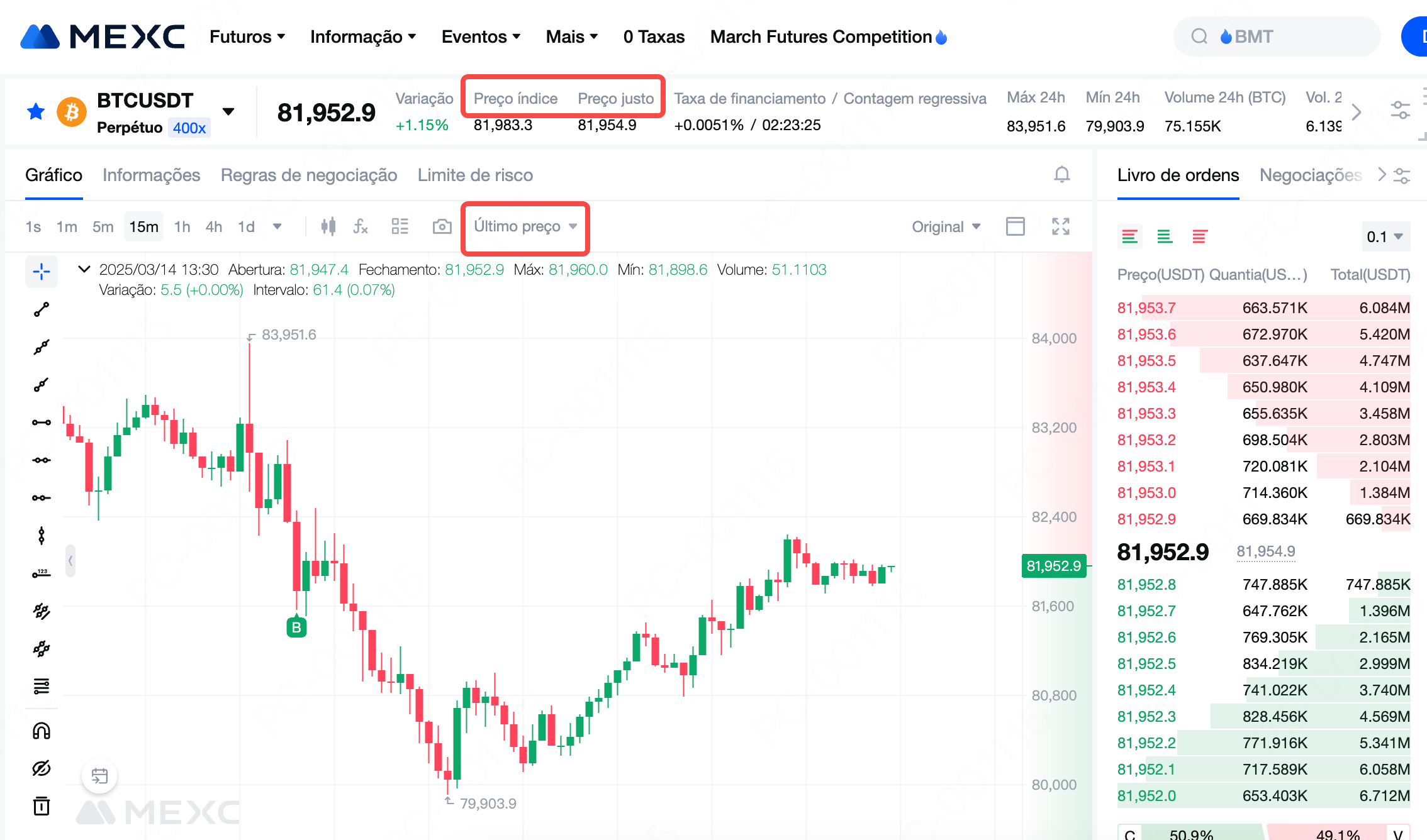 Os usuários podem visualizar o preço justo atual e sua explicação na parte superior da página de negociação. Além disso, no topo do gráfico de velas, os usuários podem alternar entre o preço justo, o último preço e o preço do índice para acompanhar as tendências dos três preços.