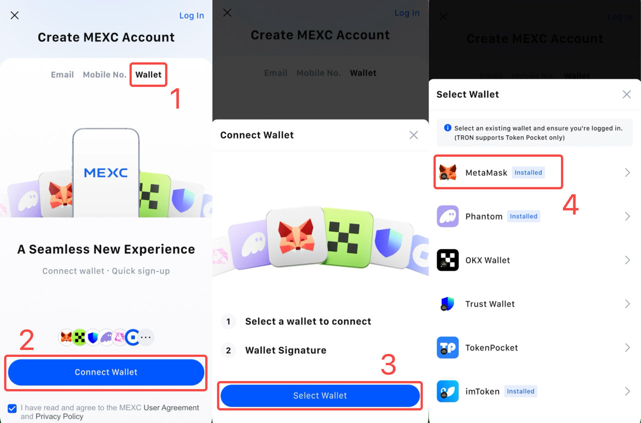 3) แตะเลือกกระเป๋าสตางค์ โปรดทราบว่าการสมัครบัญชี MEXC ผ่านทางกระเป๋าเงินนั้นมีสองขั้นตอน: เลือกและเชื่อมต่อกระเป๋าเงิน และกรอกลายเซ็นกระเป๋าเงินให้เสร็จเรียบร้อย