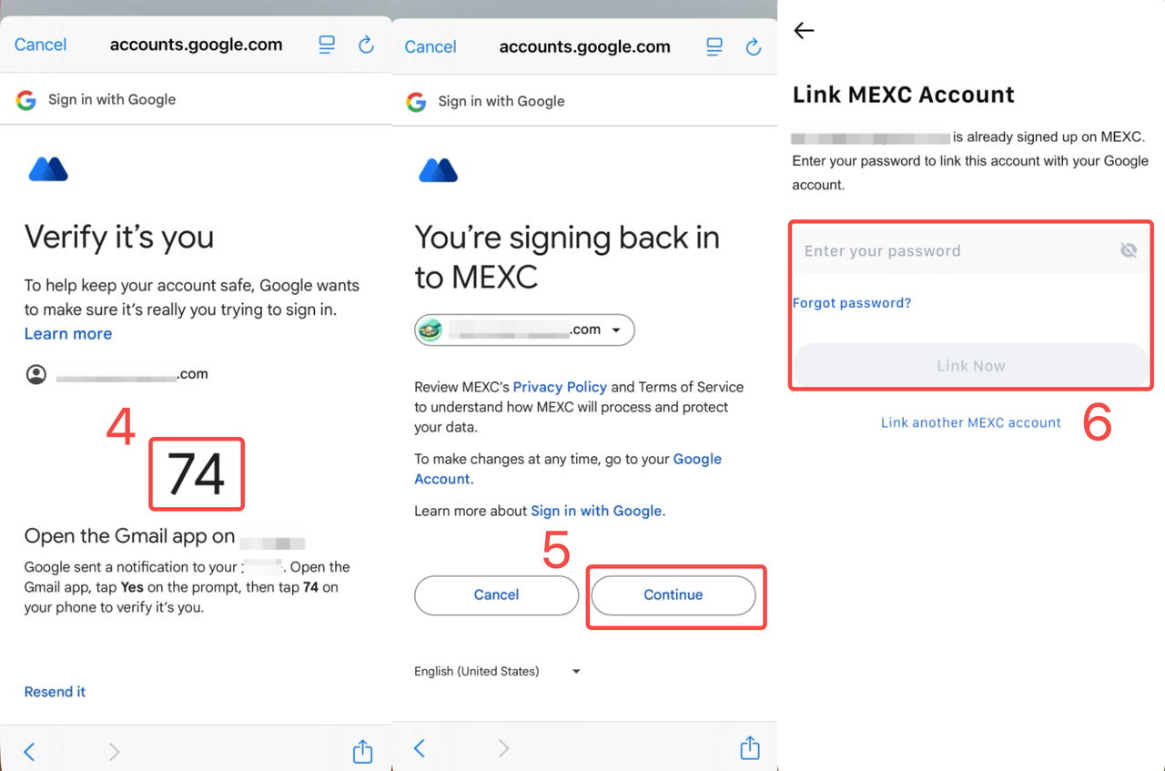 5) แตะดำเนินการต่อเพื่อเข้าสู่ระบบ MEXC อีกครั้ง