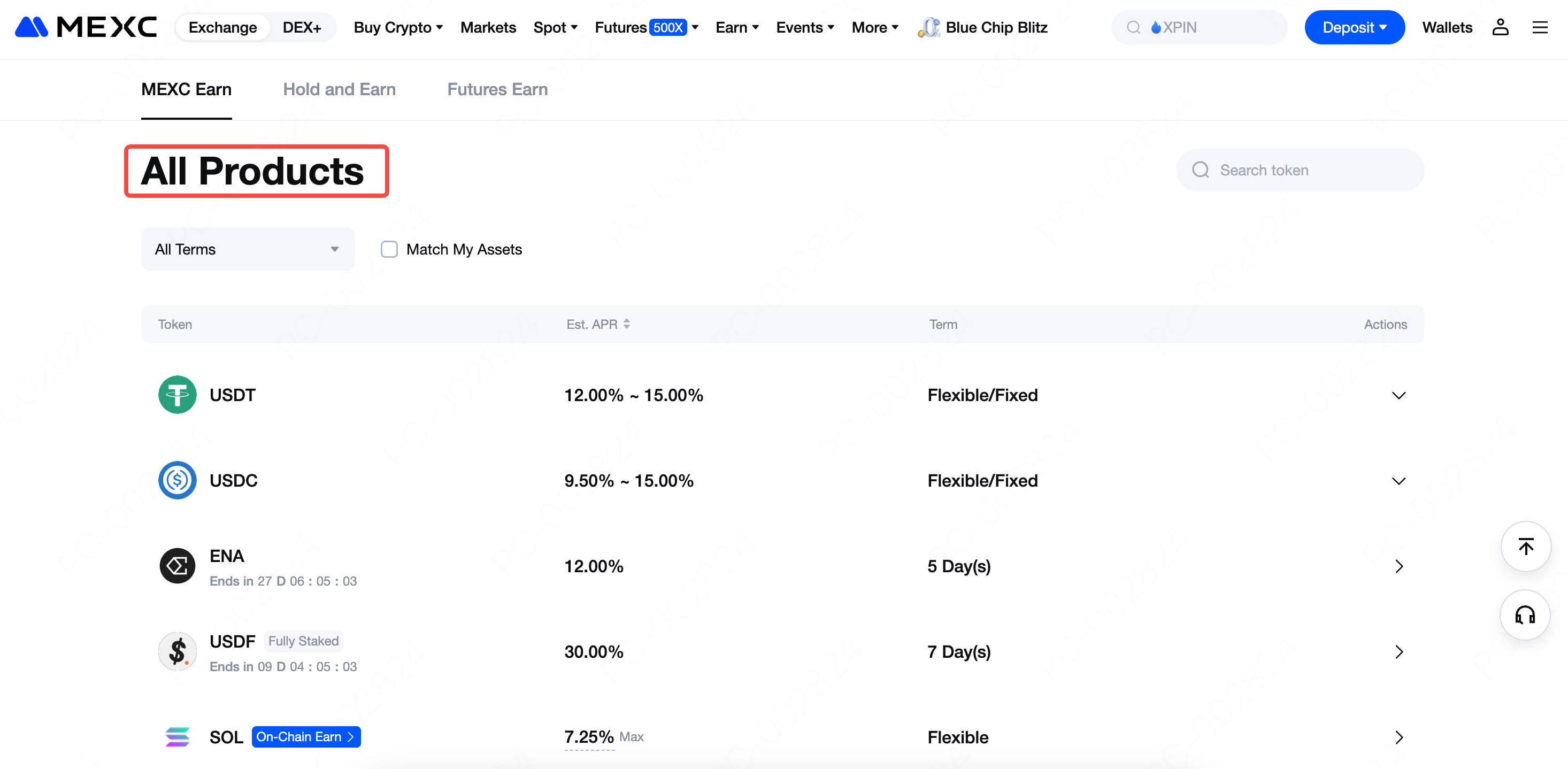 ในหน้า MEXC Earn ให้เลื่อนลงไปที่ผลิตภัณฑ์ทั้งหมด ซึ่งคุณสามารถดูผลิตภัณฑ์ Earn ประเภทต่างๆ ได้ รวมถึงการออมแบบยืดหยุ่น การออมแบบคงที่ และ Earn แบบออนเชน