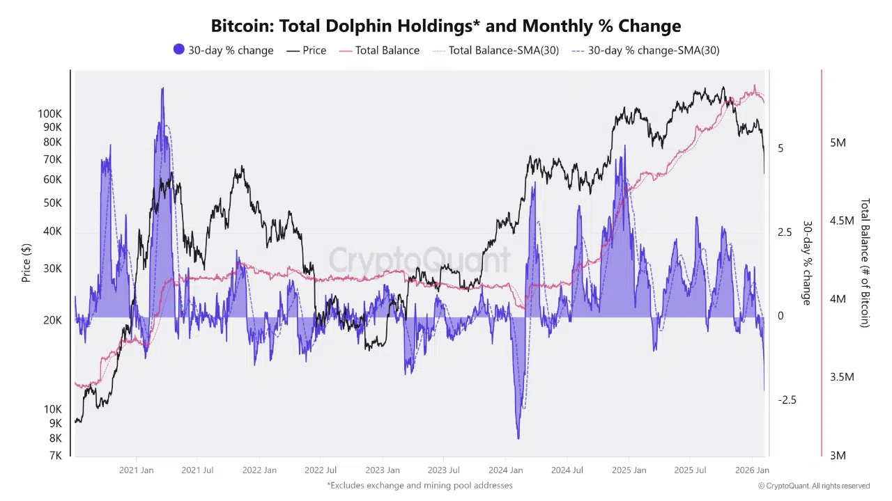 Dolphin cohorts have continued increasing their total Bitcoin holdings, with balances pressing toward new cycle highs despite recent market weakness. The 30-day change in balances remains firmly positive, indicating that this group is still net accumulating rather than distributing into rallies.
