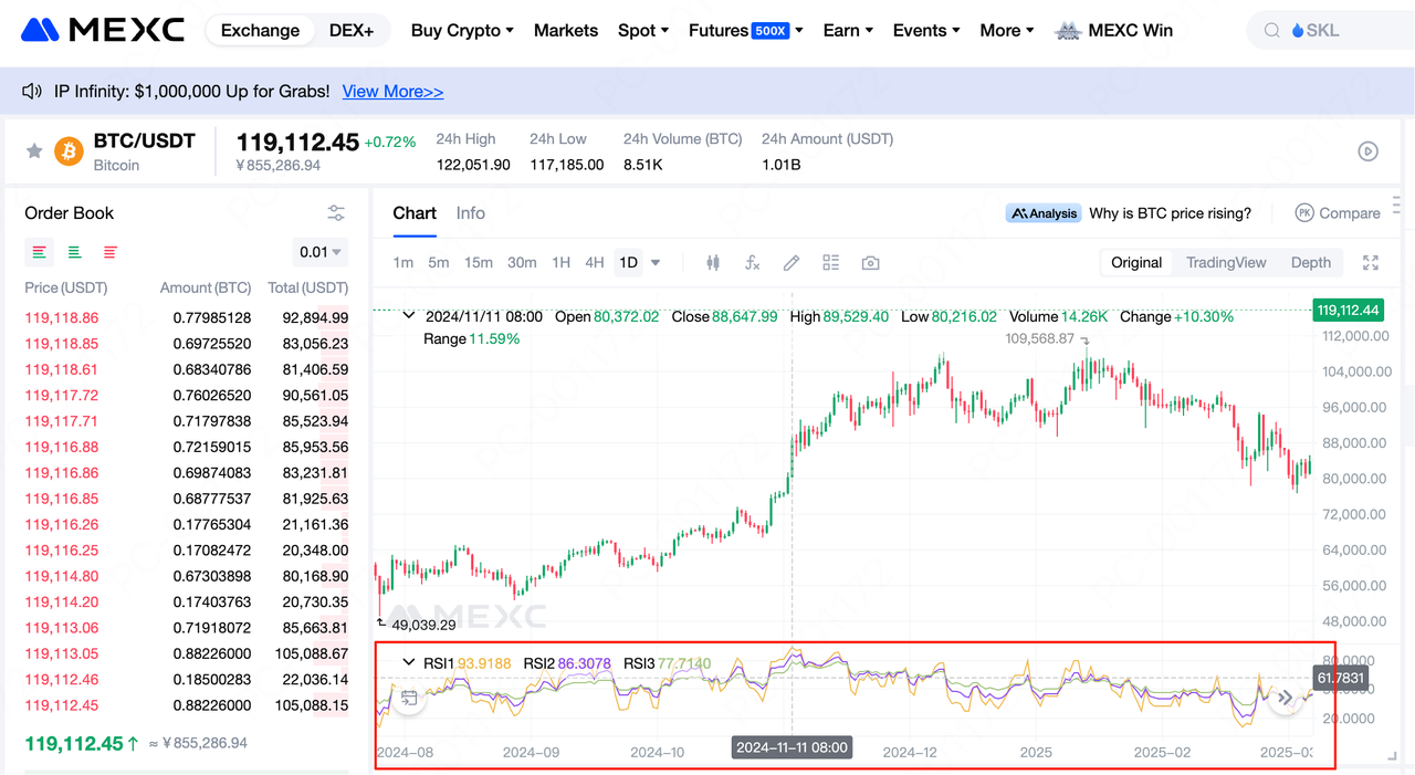 Приклад: RSI коливається в діапазоні від 0 до 100. Більш високе значення вказує на сильну бичачу динаміку, а нижче значення свідчить про домінування ведмежого тренду. Наприклад, 11 листопада 2024 року RSI для BTC перевищив верхній поріг, що вказує на перекупленість і потенційну можливість для короткострокових продажів.