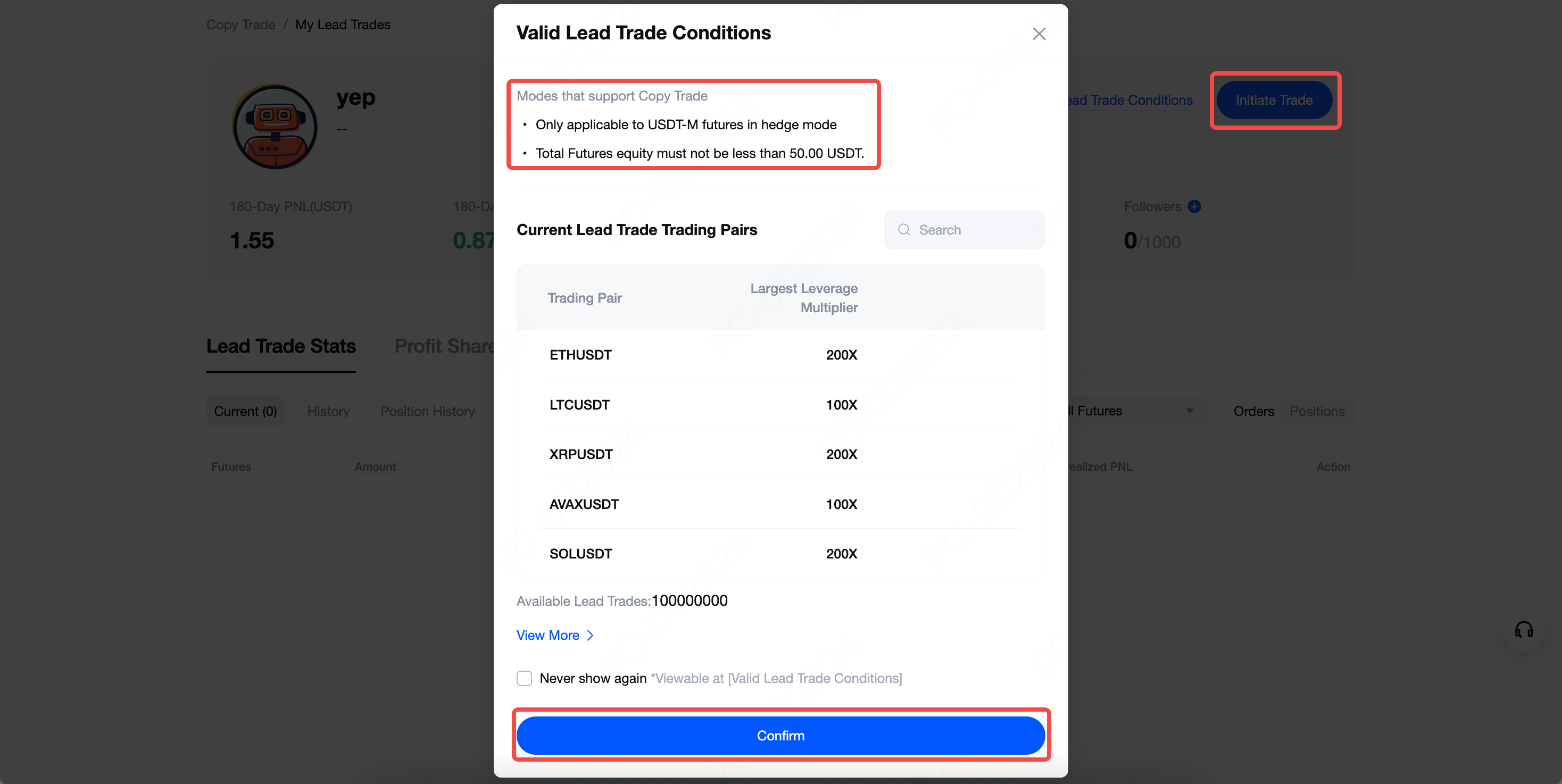 Після того, як ви завершили налаштування ваших даних для копі-трейдингу, клацніть на кнопку Розпочати торгівлю на сторінці. З'явиться спливне вікно Умови провідної торгівлі, у якому ви зможете переглянути ваші поточні торгові пари для провідної торгівлі та побачити кількість доступних угод для провідної торгівлі. Зверніть увагу, що загальний капітал вашого ф'ючерсного рахунку не повинен бути меншим за 50,00 USDT. Переконавшись, що все правильно, клацніть на кнопку Підтвердити, яка перенаправить вас на сторінку торгівлі ф'ючерсами.