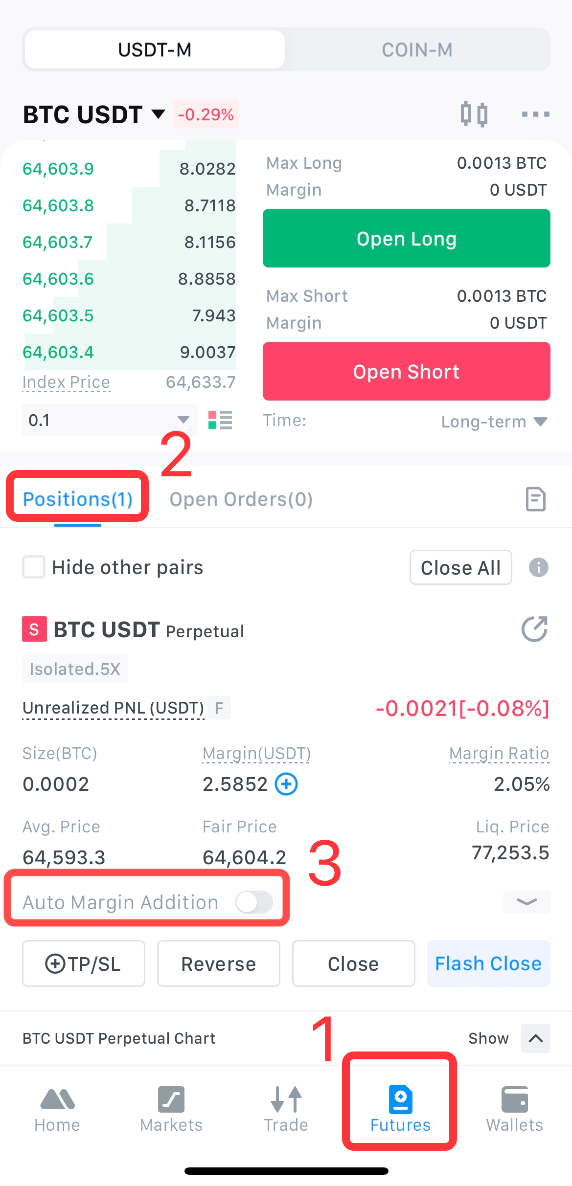 У нижній частині сторінки торгівлі ф'ючерсами, в розділі Позиції, торкніться перемикача опції Автододавання маржі, щоб увімкнути її.