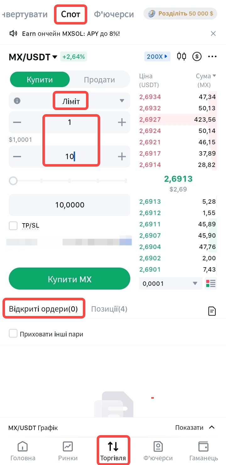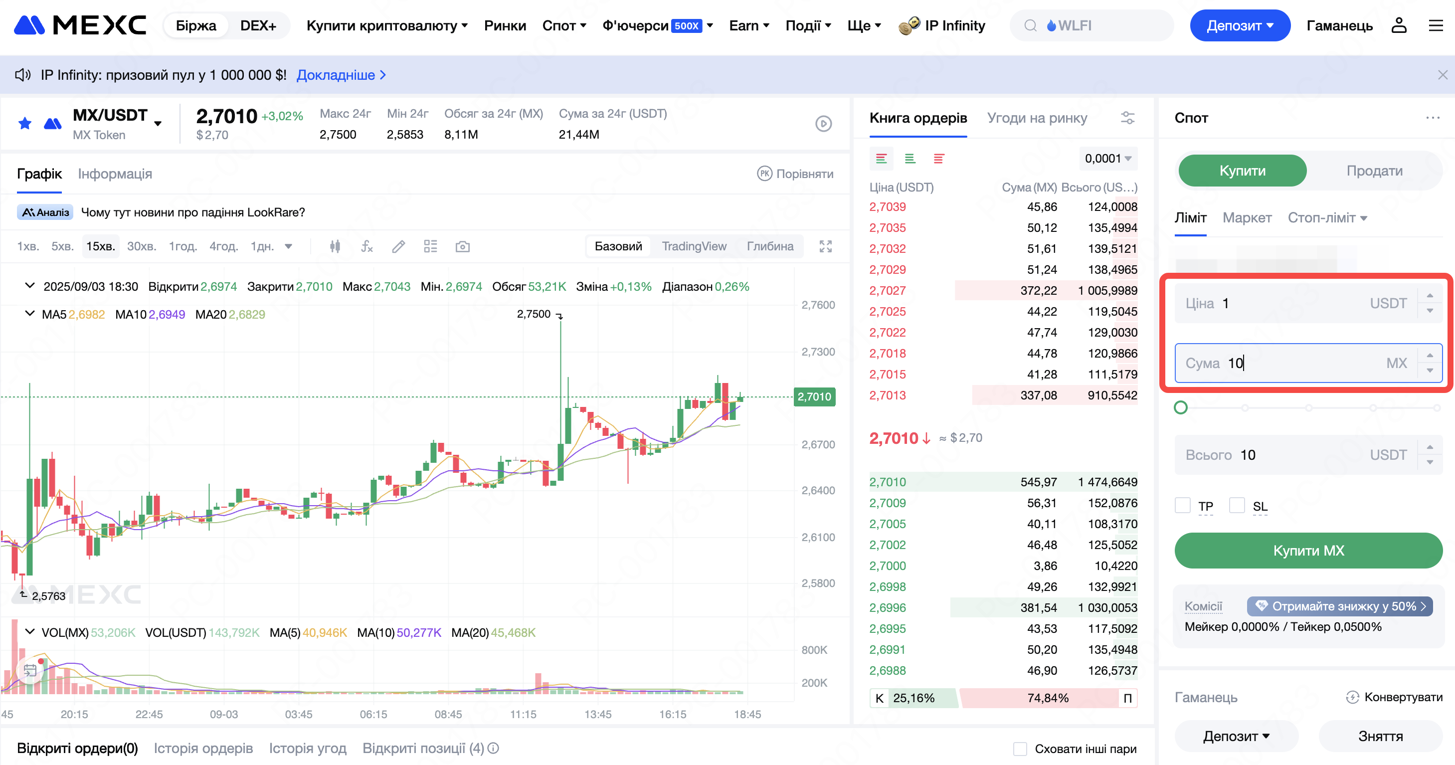 3) Введіть бажану ціну та суму MX, яку хочете придбати.