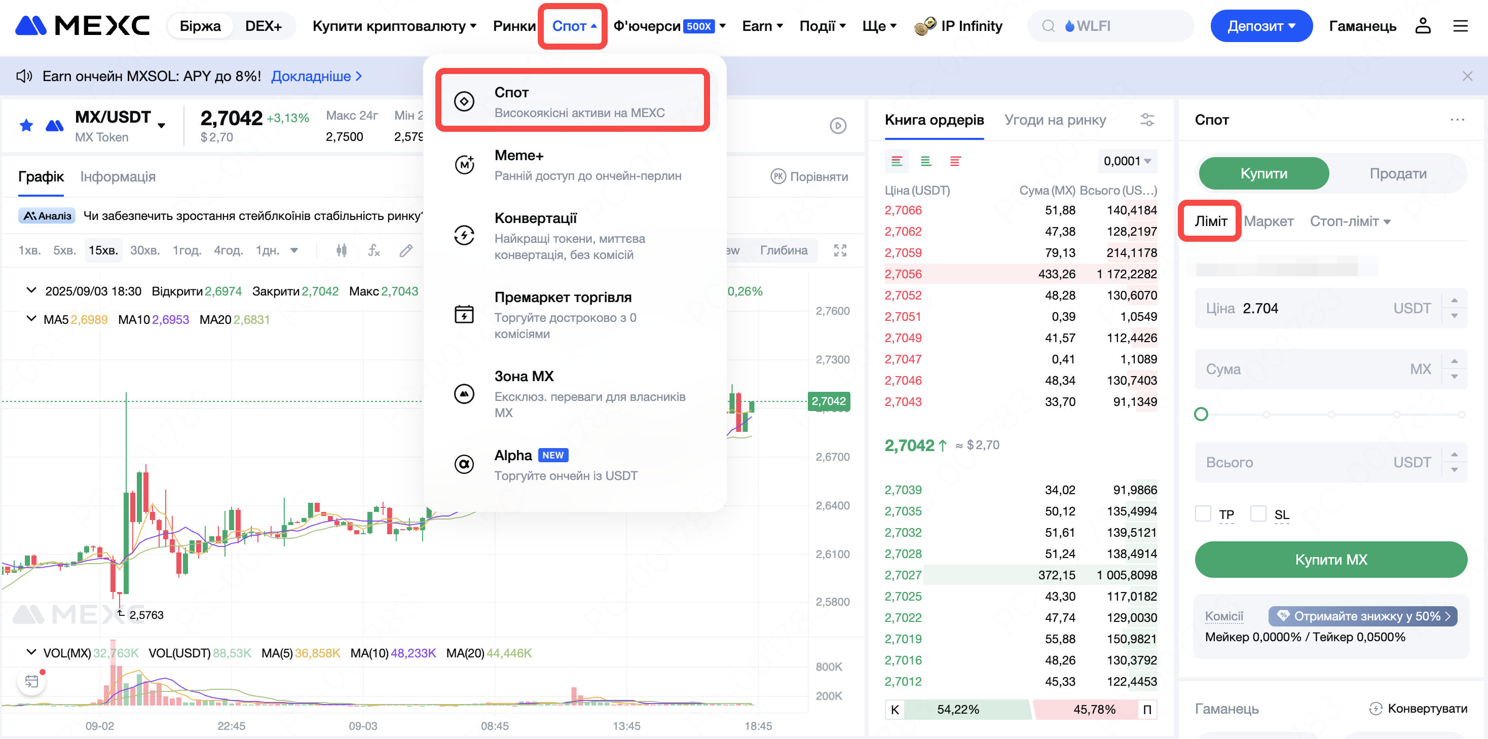 1) Перейдіть на офіційний сайт MEXC, увійдіть до свого акаунту та відкрийте сторінку спотової торгівлі.