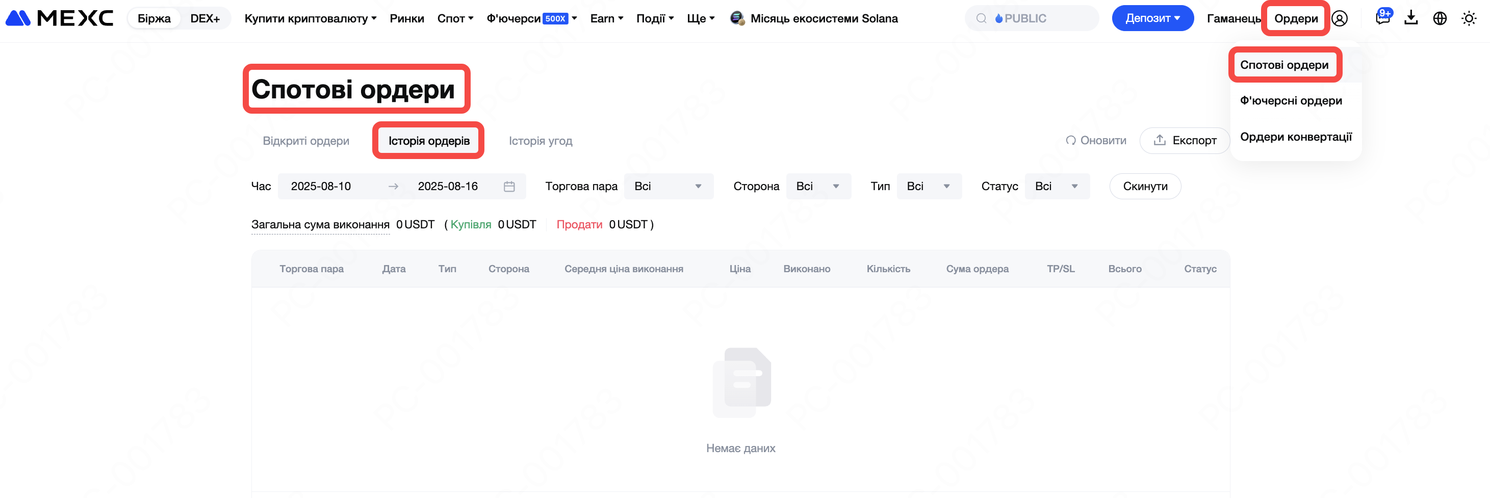 Після виконання або скасування стоп-лімітного ордера ви можете переглянути його історію в розділі Ордери → Спотові ордери → Історія ордерів.