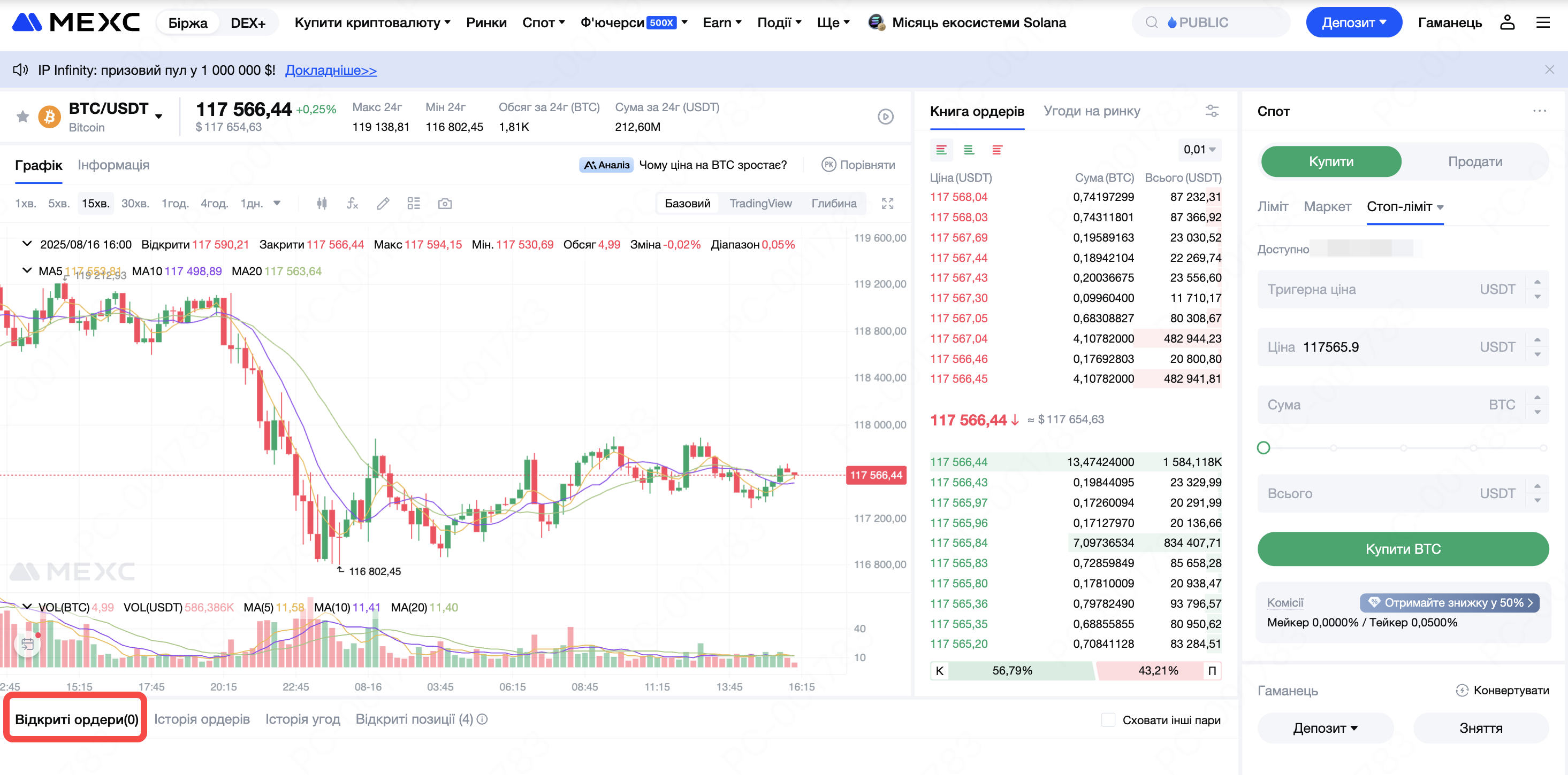 Після розміщення ордера ви можете переглянути його деталі в розділі Відкриті ордери на нижній панелі ордерів та позицій.