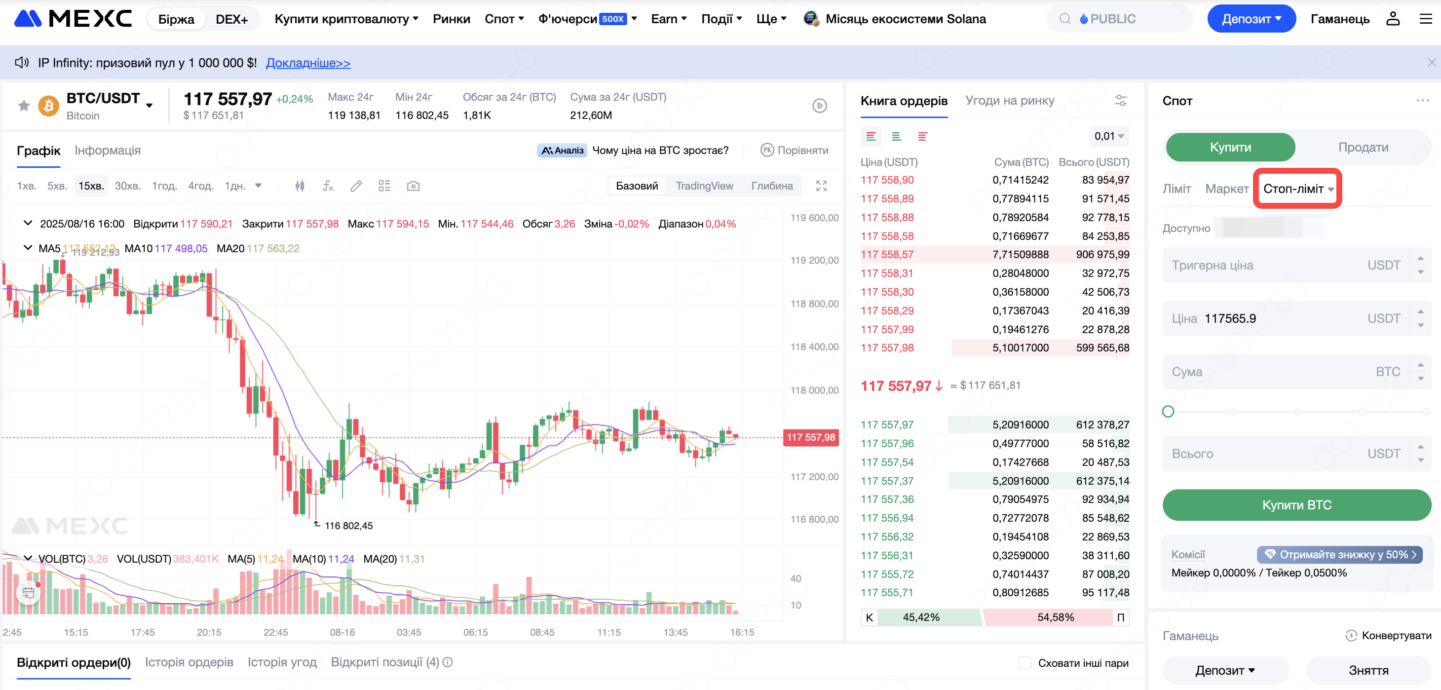 Увійдіть у свій акаунт MEXC і відкрийте сторінку торгівлі. Виберіть Стоп-ліміт, потім введіть тригерну ціну, ціну купівлі та кількість. Нарешті клацніть на Купити BTC, щоб підтвердити ордер.