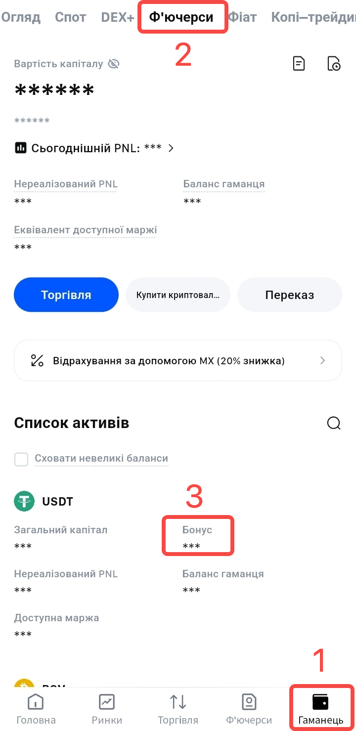 Перевірити баланс ф'ючерсного бонусу: ф'ючерсний бонус буде зараховано на ваш ф'ючерсний рахунок.
