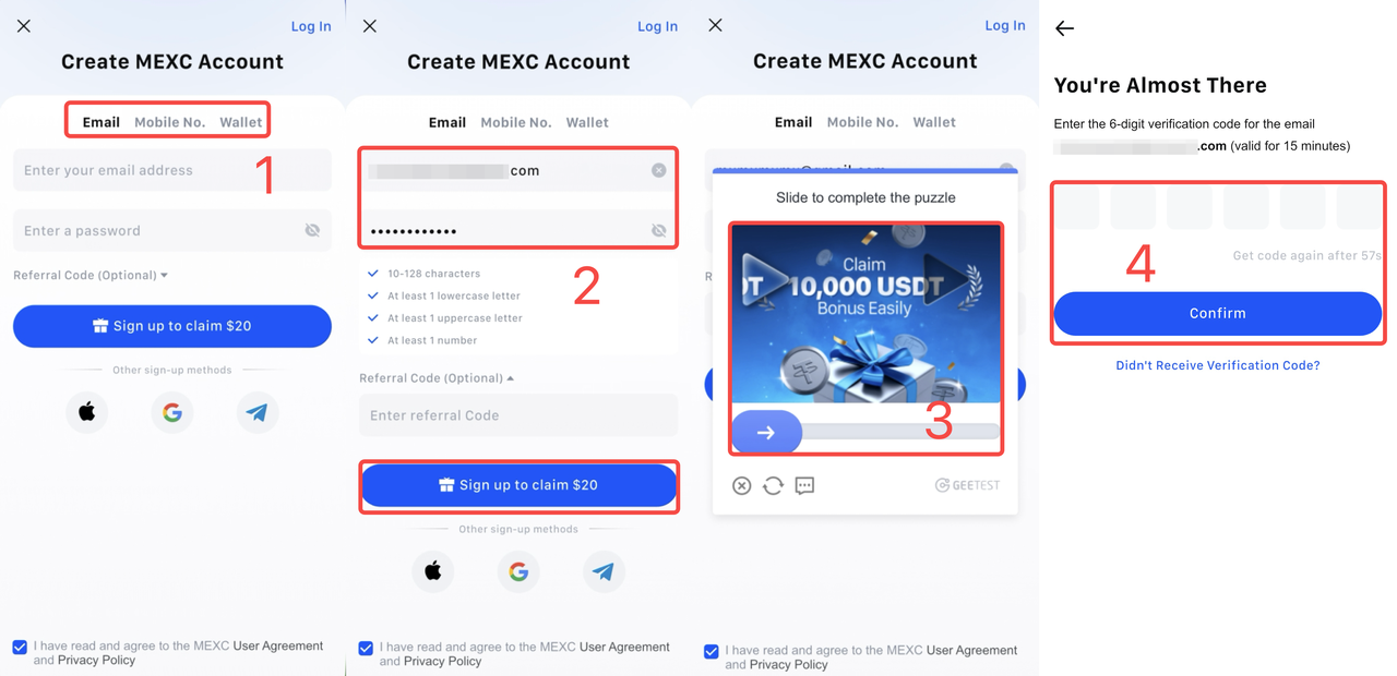 1) Mở App MEXC. Đối với người dùng mới, lần đăng nhập đầu tiên sẽ được xem là đăng ký tài khoản. Bạn có thể đăng ký bằng địa chỉ Email, số điện thoại, hoặc kết nối ví. Trong ví dụ này, chúng tôi sẽ minh hoạ quy trình đăng ký bằng Email.
