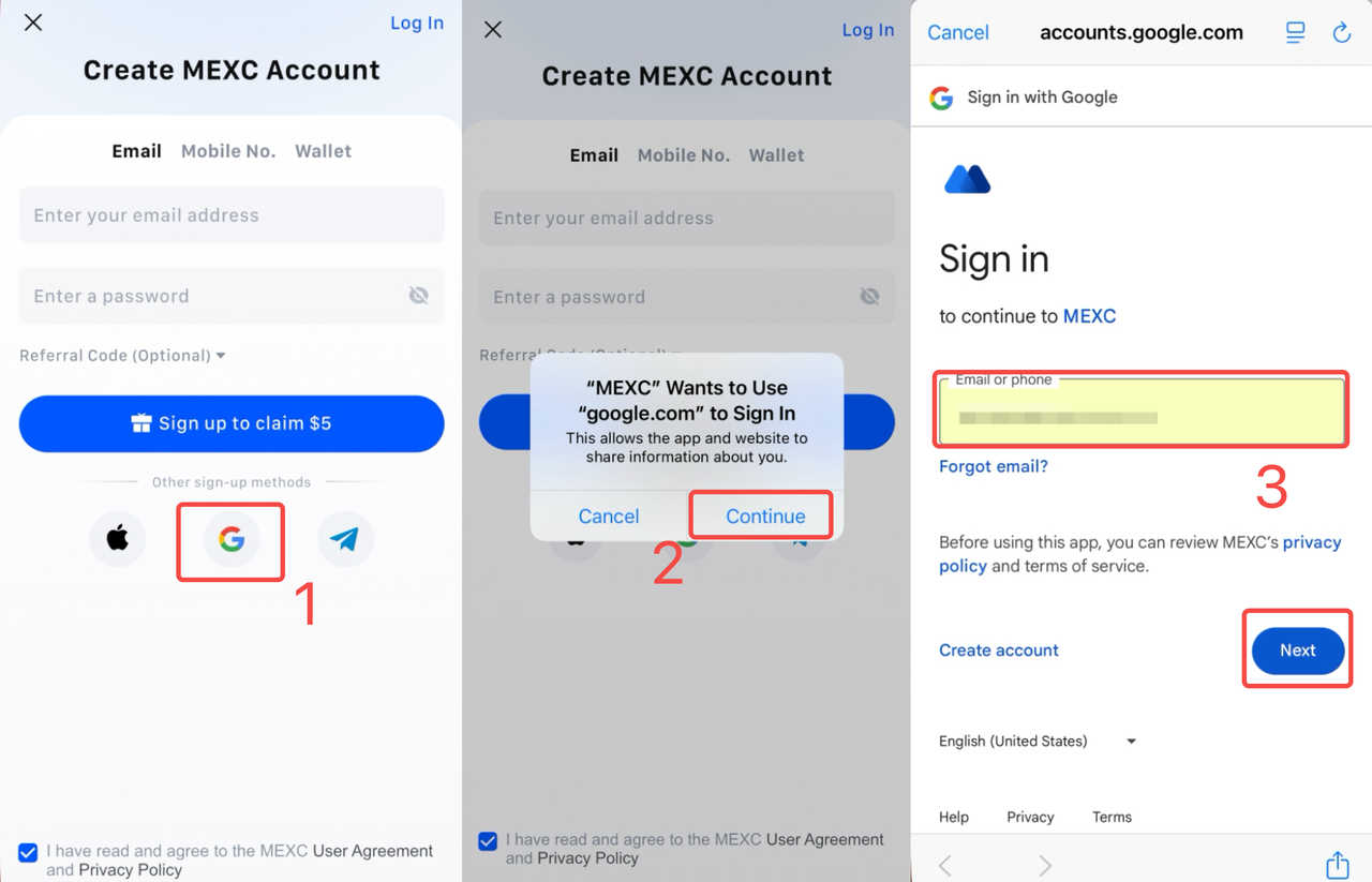 1) Mở App MEXC. Đối với người dùng mới, lần đăng nhập đầu tiên sẽ được xem là đăng ký. Nhấn vào biểu tượng Google.