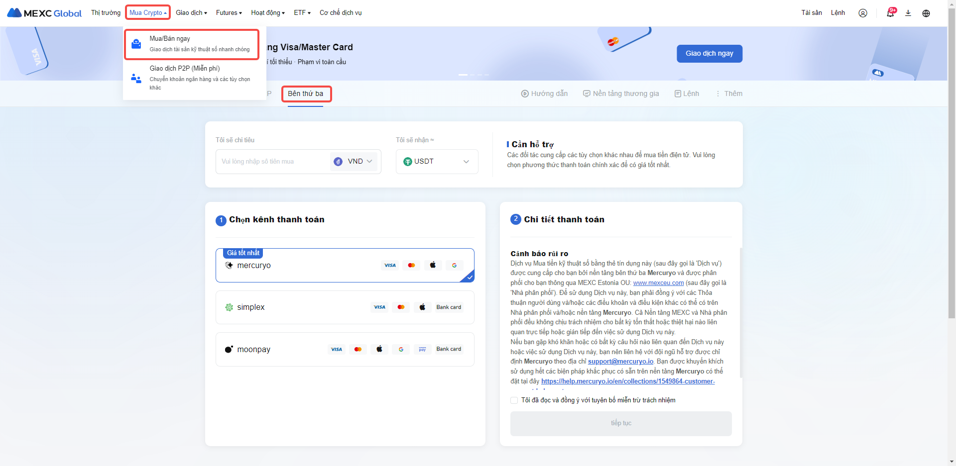 Ngoài ra, bạn có thể nhấp vào liên kết này: https://otc.mexc.com/vi-VN/creditCard