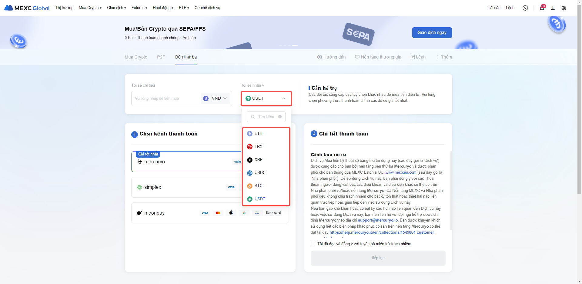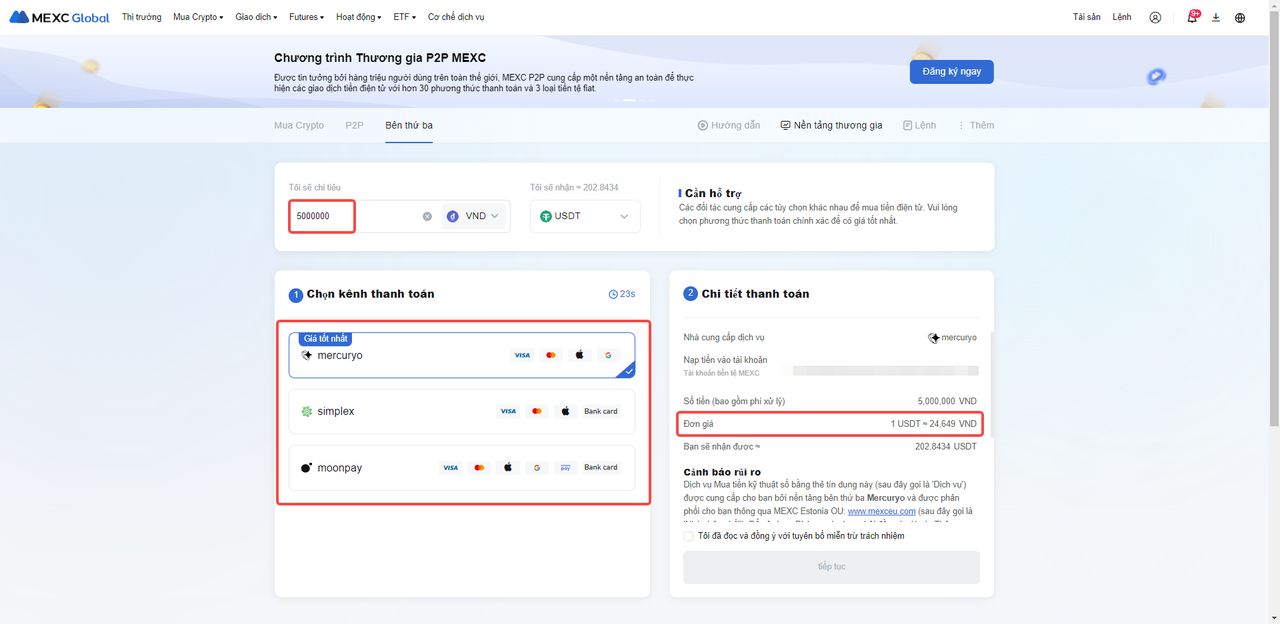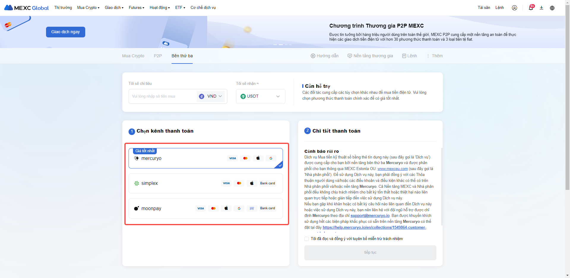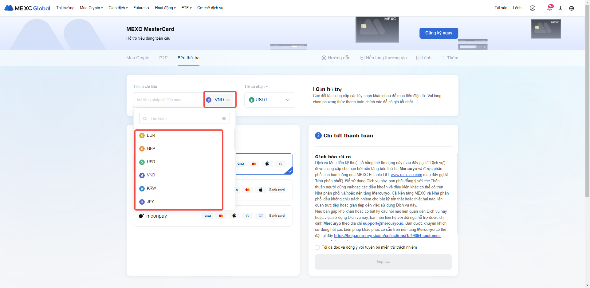 Chọn loại tiền Fiat bạn muốn thanh toán. Lấy VND làm ví dụ, có một số nhà cung cấp dịch vụ bên thứ ba mà bạn có thể chọn từ danh sách để có được giá mua tốt nhất.