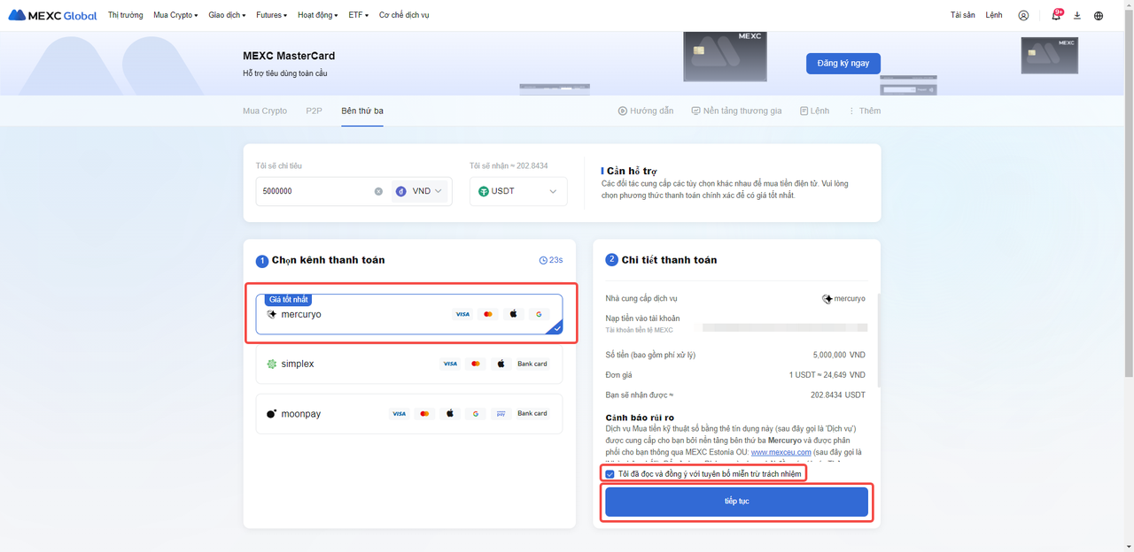 - Chỉ nhà cung cấp dịch vụ bên thứ ba mới có quyền điều chỉnh giới hạn mua và chúng tôi khuyến nghị người dùng liên hệ trực tiếp với các nhà cung cấp dịch vụ Bên thứ ba tương ứng. Bạn có thể tìm thấy thông tin liên hệ của họ trong phần Tuyên bố miễn trừ trách nhiệm tại website Kênh giao dịch bên thứ ba của chúng tôi: https://otc.mexc.com/vi-VN/creditCard