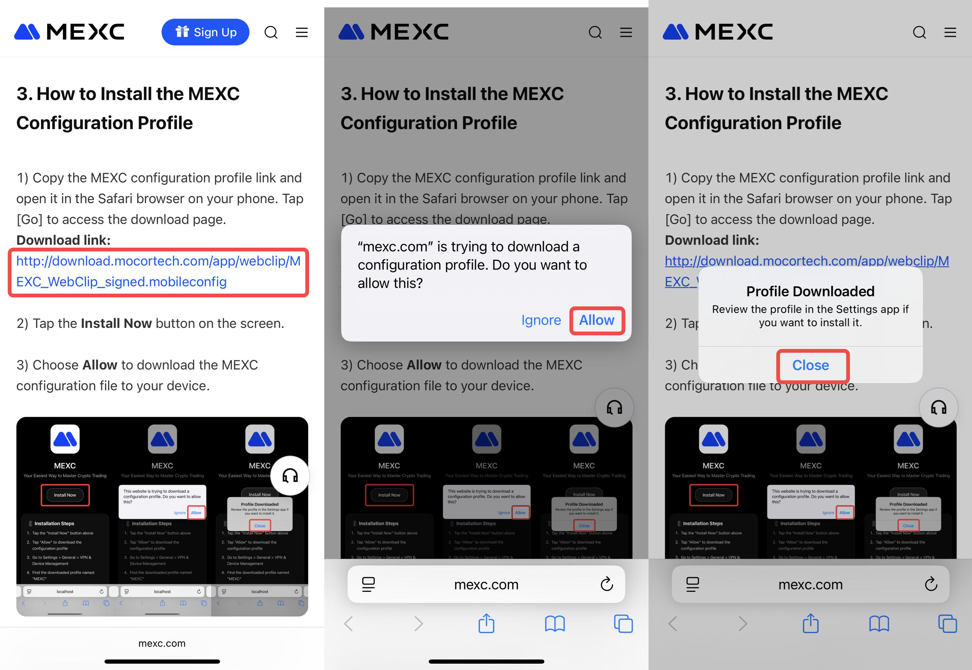 1) Sao chép liên kết hồ sơ cấu hình MEXC và mở bằng trình duyệt Safari trên điện thoại. Nhấn Đi để truy cập trang tải về.