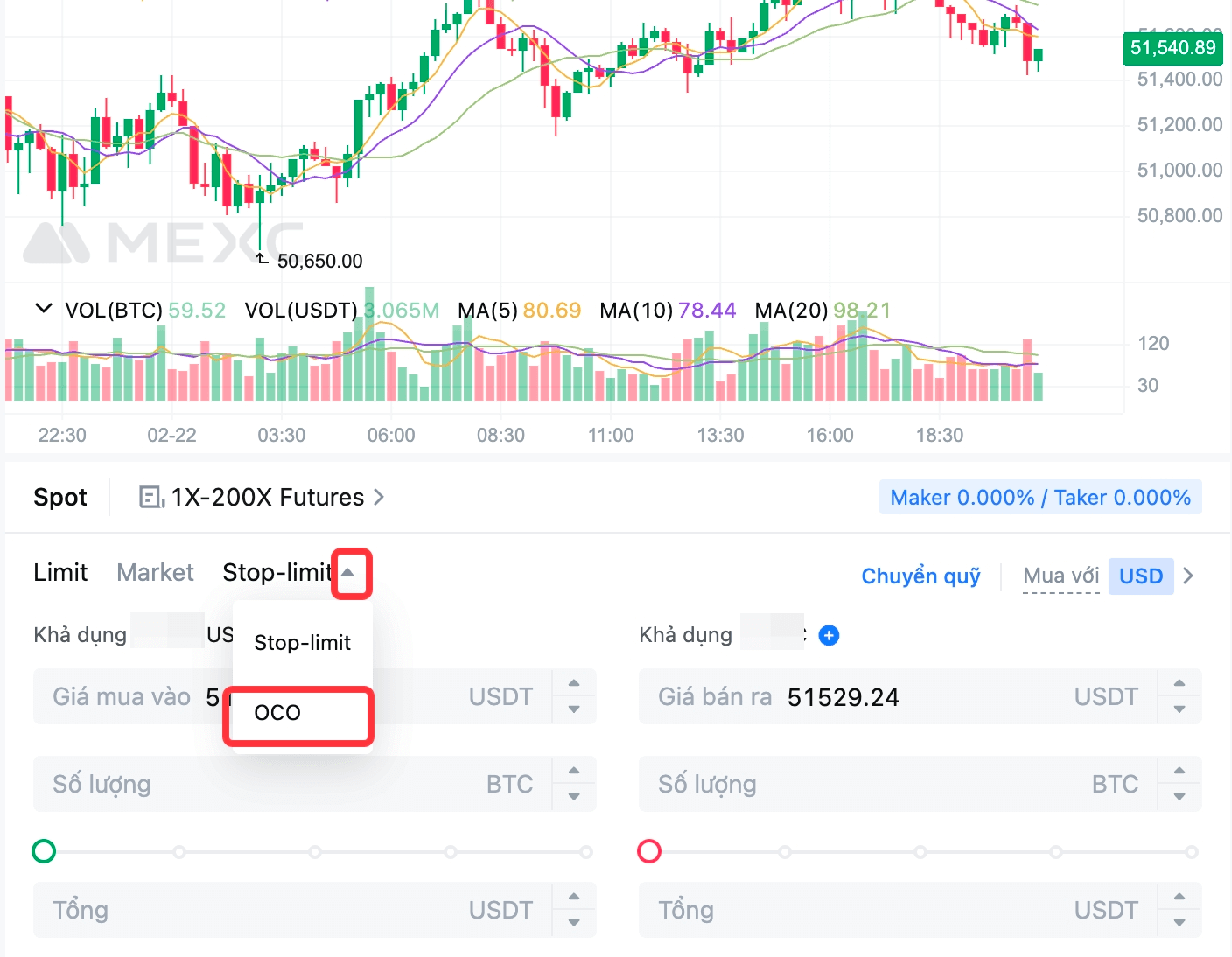 Bước 1: Truy cập vào trang giao dịch Spot BTC/USDT, nhấn vào nút "thả xuống" bên cạnh "Stop-limit" và sau đó nhấn vào "OCO".