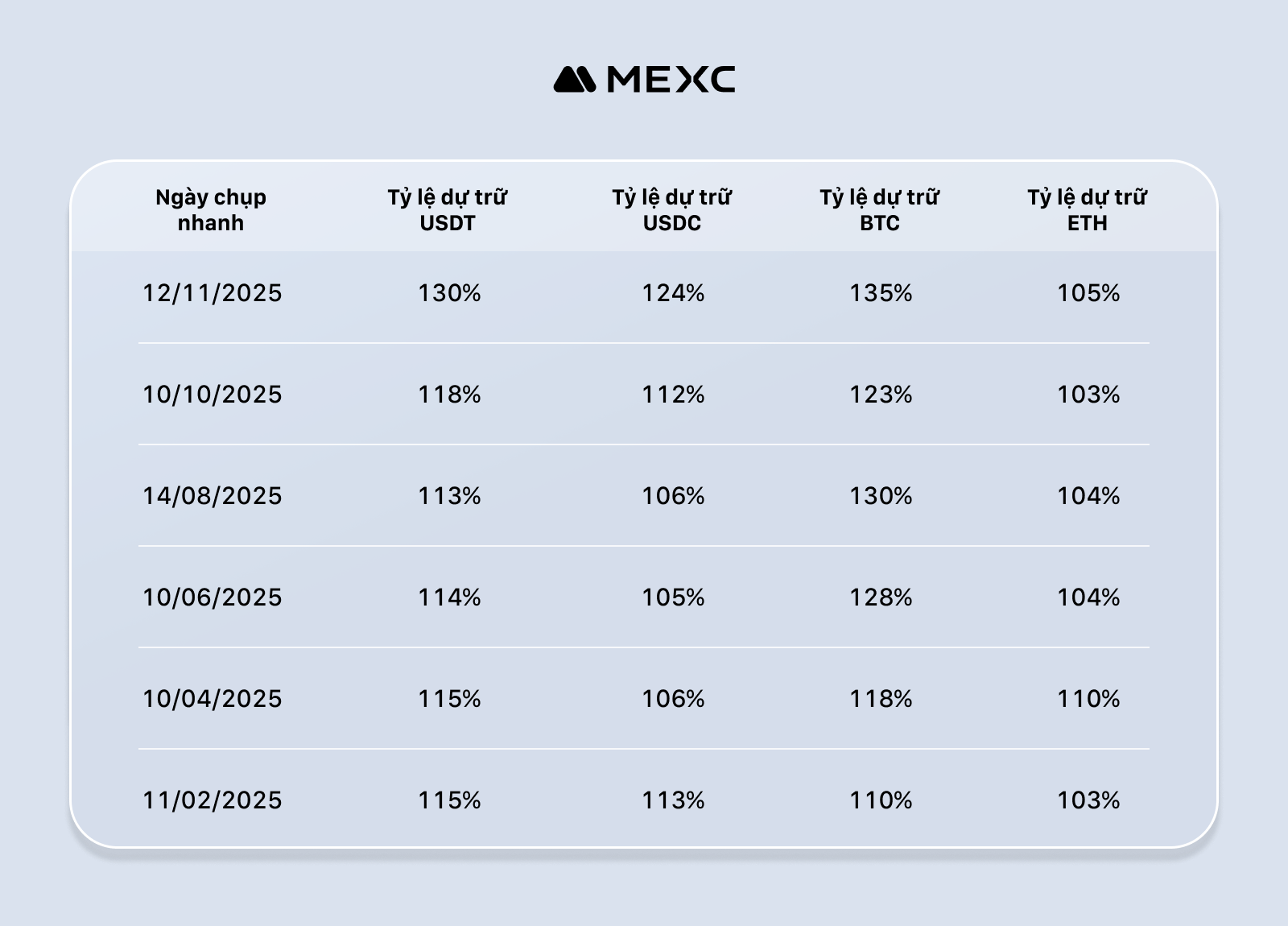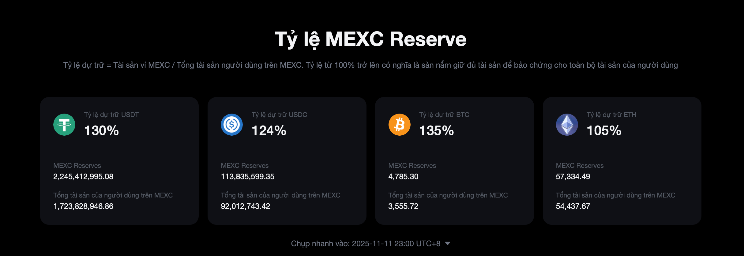 Những con số này phản ánh dự trữ của MEXC cho tất cả các tài sản chính đều vượt mức 100%, cho thấy sàn giao dịch này duy trì khoản dư đủ để đảm bảo chi trả toàn bộ tài sản của người dùng ngay cả trong điều kiện thị trường khắc nghiệt.
