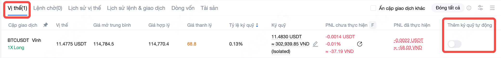 Ở cuối trang giao dịch Futures, trong mục Vị thế, bật nút Thêm ký quỹ tự động để kích hoạt.