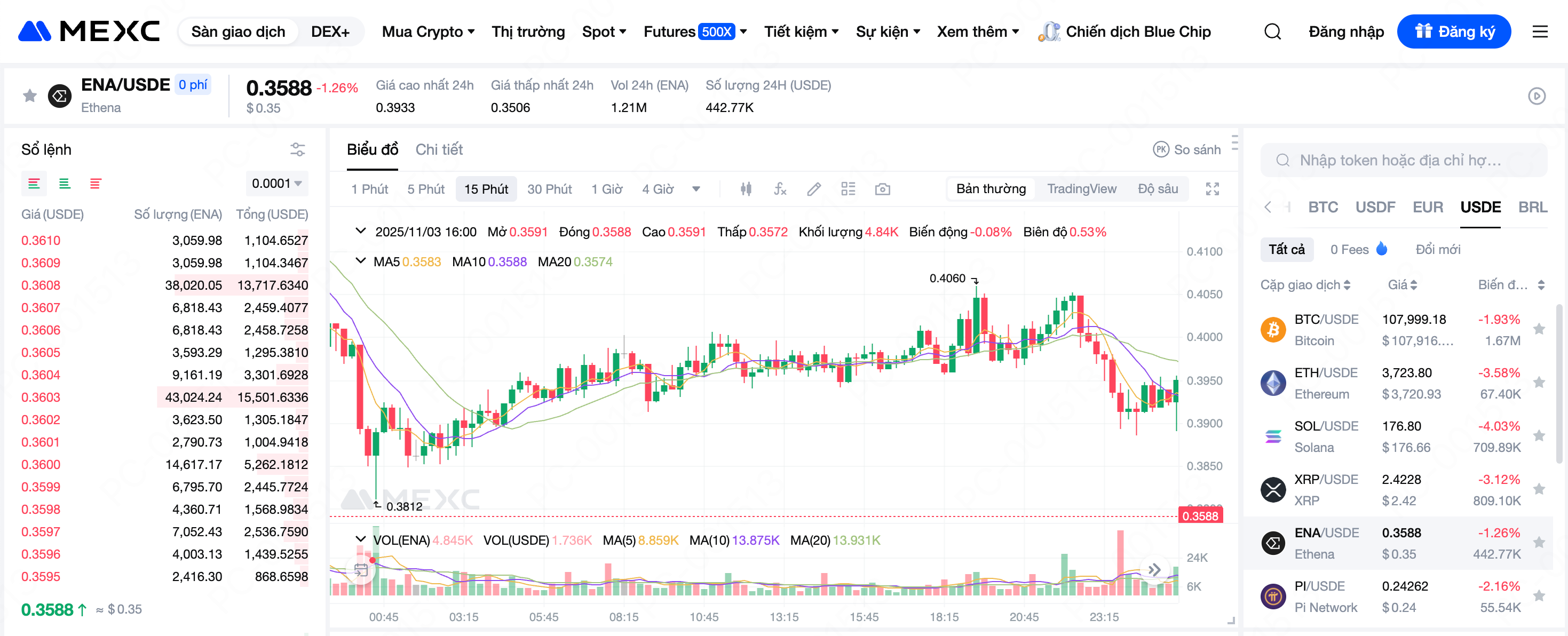 Người dùng có thể mua token Ethena (ENA) trực tiếp trên MEXC, sàn giao dịch tập trung vào việc khám phá các tài sản chất lượng, mang đến cơ hội tiếp cận các token phổ biến và mới nổi. Với danh mục tài sản đa dạng, phí giao dịch cực thấp và môi trường giao dịch an toàn, ổn định, MEXC đã trở thành lựa chọn đáng tin cậy của người dùng.