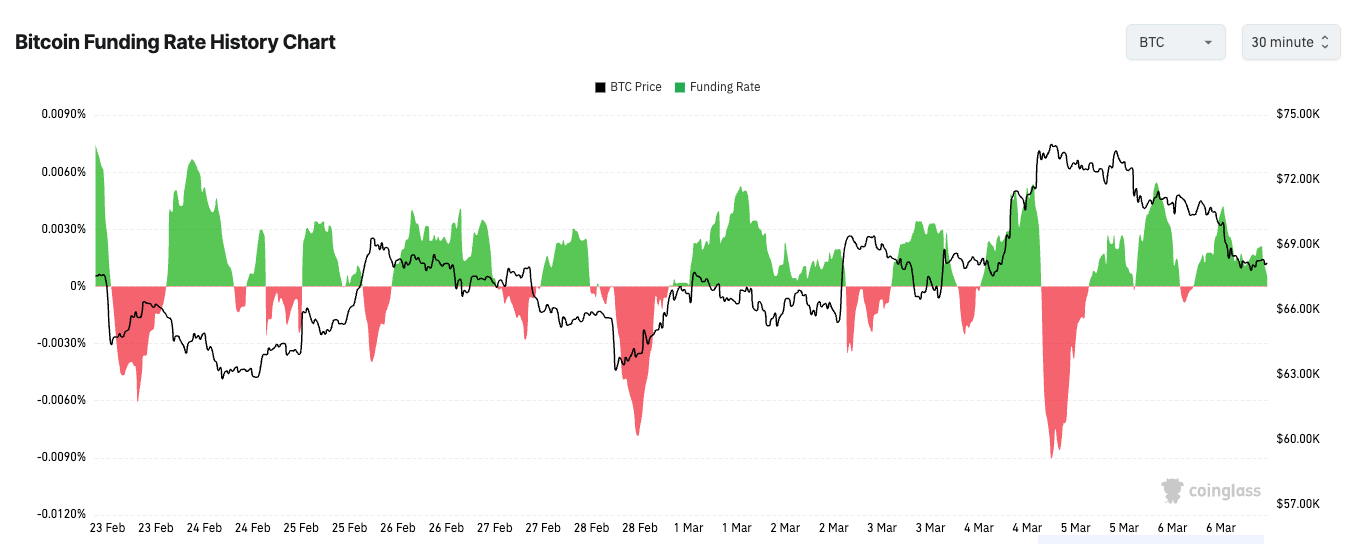 Biểu đồ thể hiện tỷ lệ phí tài trợ cho hợp đồng tương lai vĩnh viễn Bitcoin từ ngày 22 tháng 2 đến ngày 7 tháng 3 năm 2026 (Nguồn: CoinGlass)