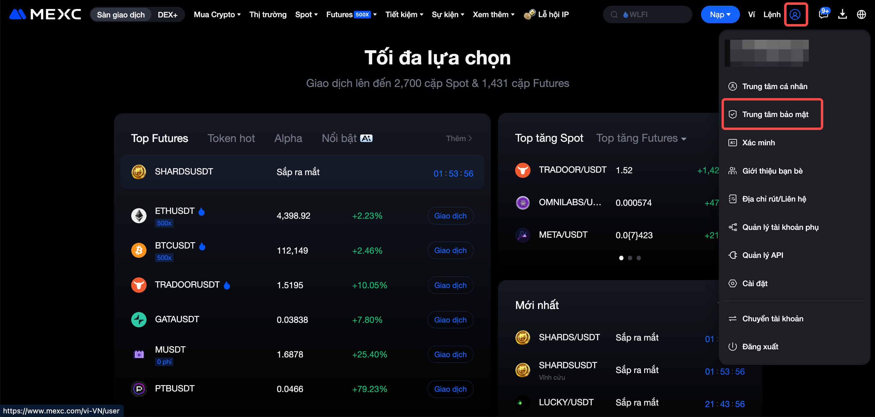 1) Truy cập trang web chính thức của MEXC và đăng nhập vào tài khoản của bạn. Từ biểu tượng người dùng, điều hướng đến mục Trung tâm bảo mật.
