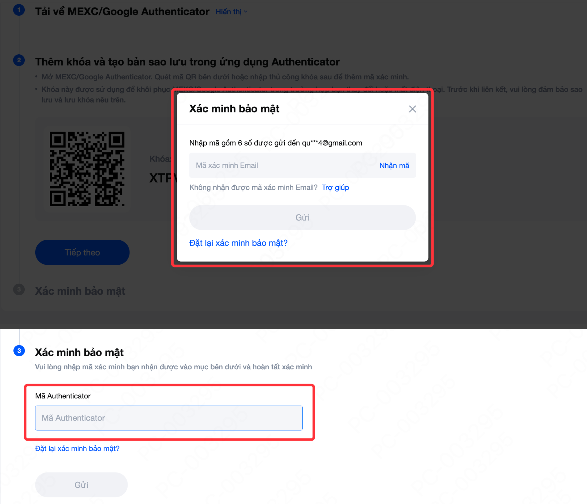 5) Nhấn Nhận mã, kiểm tra và nhập mã xác minh được gửi đến địa chỉ Email đã liên kết, sau đó nhấn Gửi. Tiếp theo, nhập mã 6 chữ số được tạo bởi Google Authenticator. Sau khi đã điền đầy đủ mã, nhấn Gửi để hoàn tất quá trình liên kết.