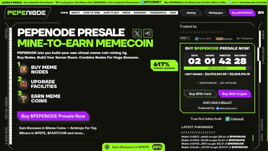 Pepenode ($PEPENODE)是一种新的迷因币,通过"挖矿赚取"GameFi模式将青蛙主题迷因币的病毒式吸引力与真实实用性结合起来。该项目消除了加密货币挖矿的常见障碍,如购买昂贵硬件、高电费和技术设置。