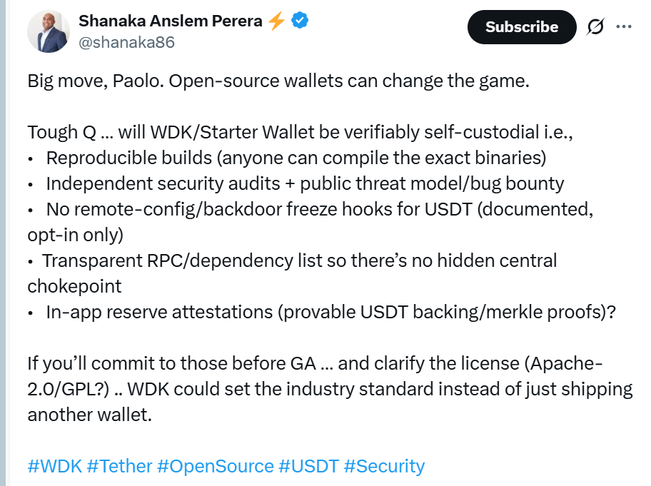 他强调了 WDK 需要可重现构建、开放审计和明确的许可条款,以确保其保持可验证的自托管性。如果 Tether 解决了这些问题,WDK 可能会为钱包框架设定新的行业基准。
