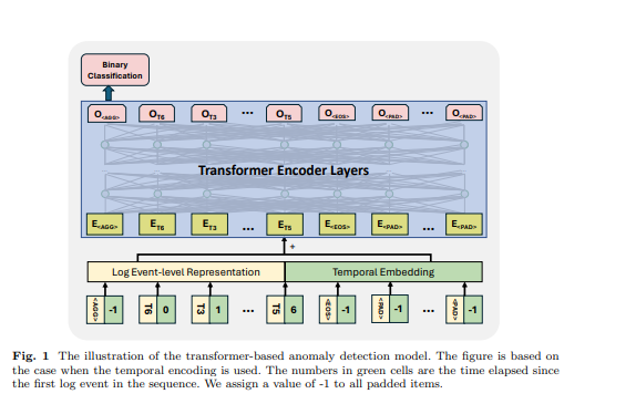 Transformer是一种依赖自注意力机制捕获序列中输入元素之间关系的神经网络架构。基于transformer的模型和框架已被许多先前工作用于异常检测任务[6, 11, 12, 21]。受先前工作的启发,我们使用基于transformer编码器的模型进行异常检测。我们设计的方法接受不同长度的日志序列并生成序列级表示。为实现这一点,我们在输入日志序列中使用了一些特定标记,使模型能够生成序列表示并识别填充标记和日志序列的结束,这一灵感来自BERT模型[31]的设计。在输入日志序列中,我们使用以下标记:放置在每个序列开始处,使模型能够为整个序列生成聚合信息;添加在序列末尾,表示其完成;用于标记自监督训练范式下的掩码标记;用于填充标记。这些特殊标记的嵌入是基于所使用的日志表示维度随机生成的。图1中显示了一个示例,、和的时间流逝设置为-1。日志事件级表示和位置或时间嵌入相加作为transformer结构的输入特征。