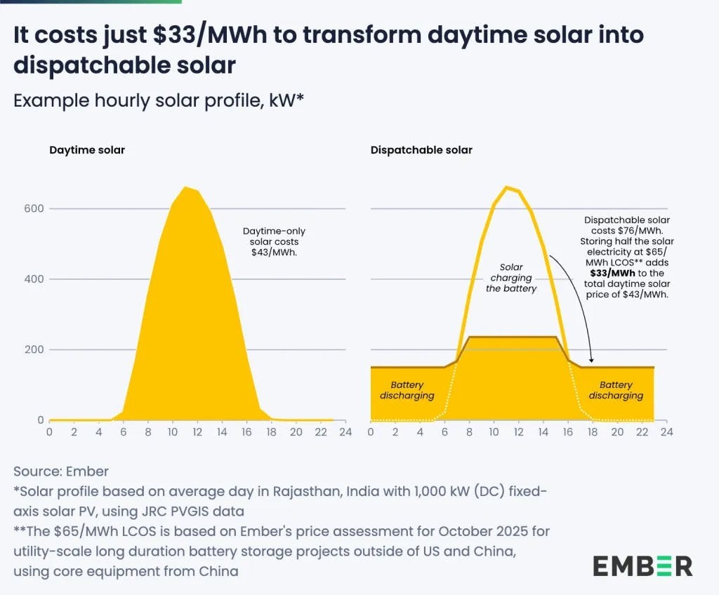 太陽能價格持續下降、儲能效率提升,再加上電池系統成本急降,使「再生能源+儲能」的組合具備能擴充、可預測且更穩定的供電能力。Ember 強調,這組合正快速成為未來電力系統的基礎設計之一。