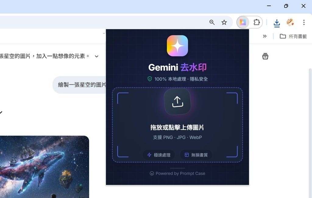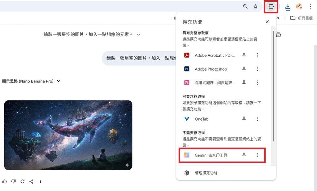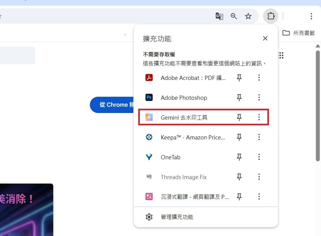 ▲下載圖片後,接著點選Chrome右上角的擴充功能欄位,選擇「Gemini去水印工具」。
