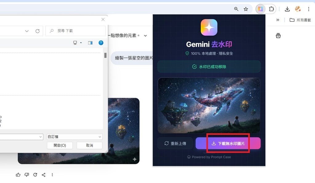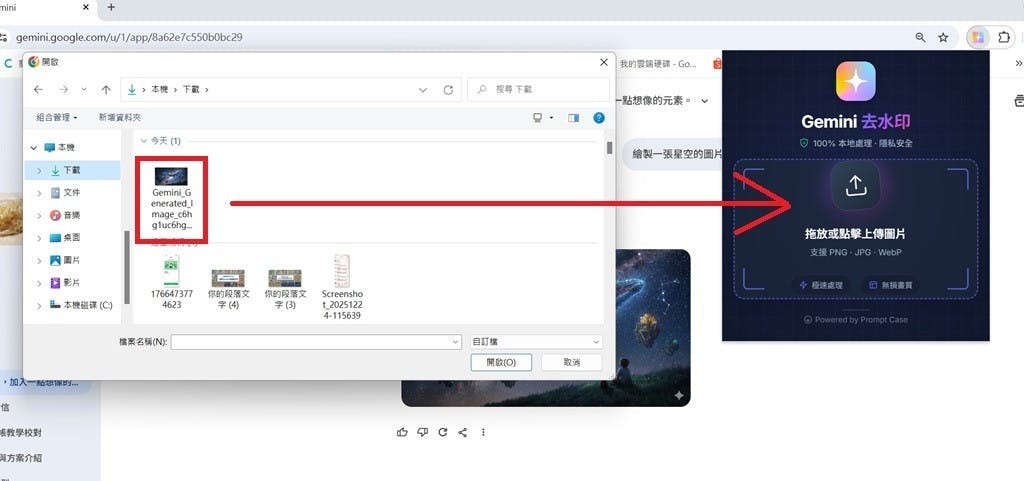 ▲系統會跳出視窗,可以清楚看見圖片上傳位置。Gemini去水印工具支援PNG、JPG、WebP檔案。
