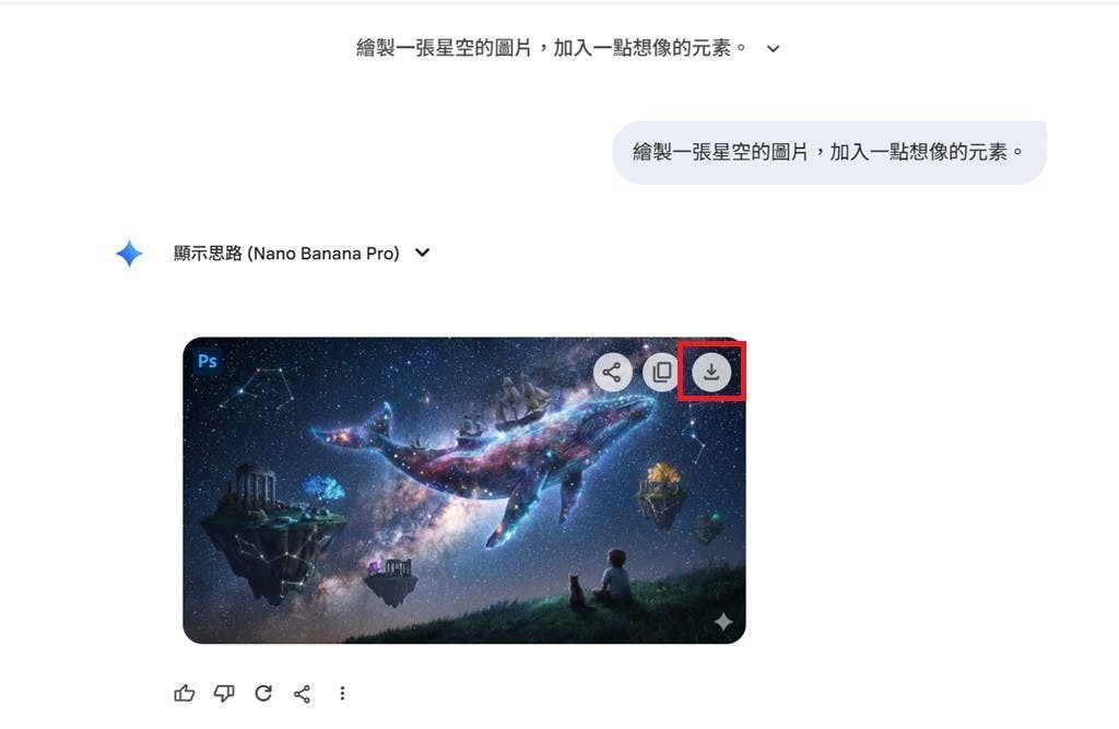 ▲回到Gemini,在要求Gemini繪製圖片後,先點選下載按鍵將圖片下載下來。