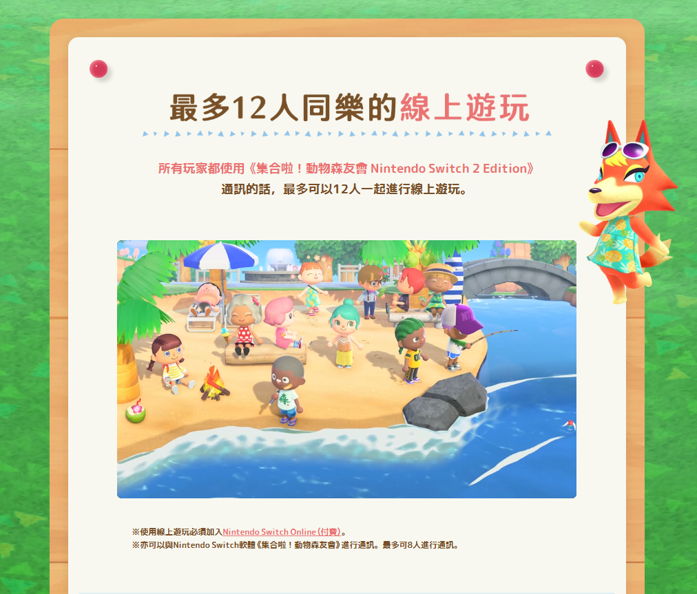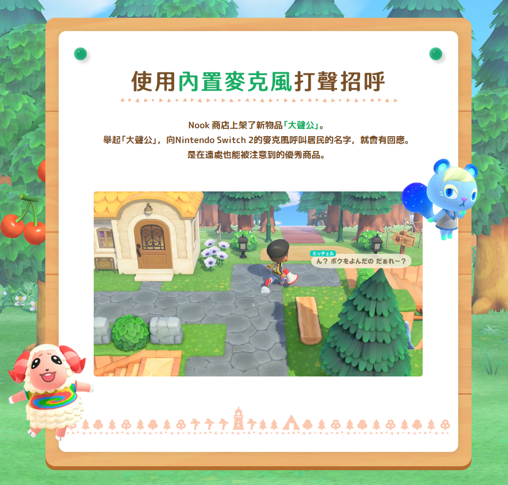 雖然動物森友會是個有點時間的遊戲了,不過任天堂這次直接讓它免費更新到3.0版本,加了一大堆新功能與家具。不僅如此,還推出Switch 2的新版本,可從原本的遊戲付費升級或購買Switch 2版本來玩,Switch 2版最多可支援12人線上同樂,並且可使用Joy-Con 2滑鼠來操作,並且遊戲中有專屬大聲公可使用內建麥克雖然動物森友會是個有點時間的遊戲了,不過任天堂這次直接讓它免費更新到3.0版本,加了一大堆新功能與家具。不僅如此,還推出Switch 2的新版本,可從原本的遊戲付費升級或購買Switch 2版本來玩,Switch 2版最多可支援12人線上同樂,並且可使用Joy-Con 2滑鼠來操作,並且遊戲中有專屬大聲公可使用內建麥克