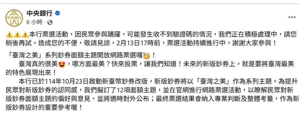 中央銀行將新台幣新版紙鈔圖案主軸定調為「台灣之美」,設計12項子主題,涵蓋體育、工藝、建築、科技、保育等,預計將選出5個主題作為未來新版紙鈔100元至2000元面額圖案參考。新台幣紙鈔改版線上投票活動目前已開放參與,預計將持續投票至2月13日下午17點,至於投票結果公布時間將另行公告。
