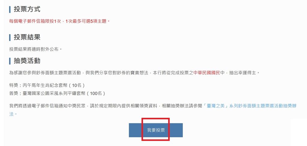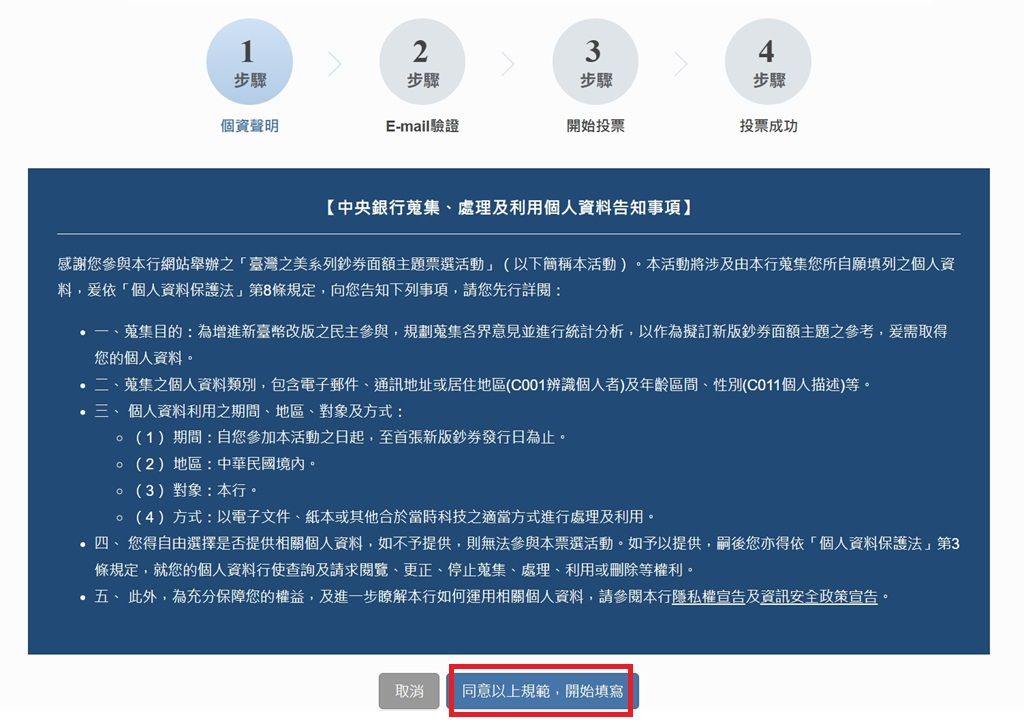 ▲前往中央銀行網頁「線上投票」頁面後,即可看見新版紙鈔改版投票相關資訊。▲於同個頁面往下到底部,可看見「我要投票」選項。▲點選後,同意服務條款。▲輸入電子信箱並完成驗證。須注意若使用的是Yahoo、Hotmail等信箱,驗證信件可能會被當作廣告信件或垃圾信件。▲完成信箱驗證後就能夠進入投票頁面,可以從12個主題中選出喜歡的5個主題。
