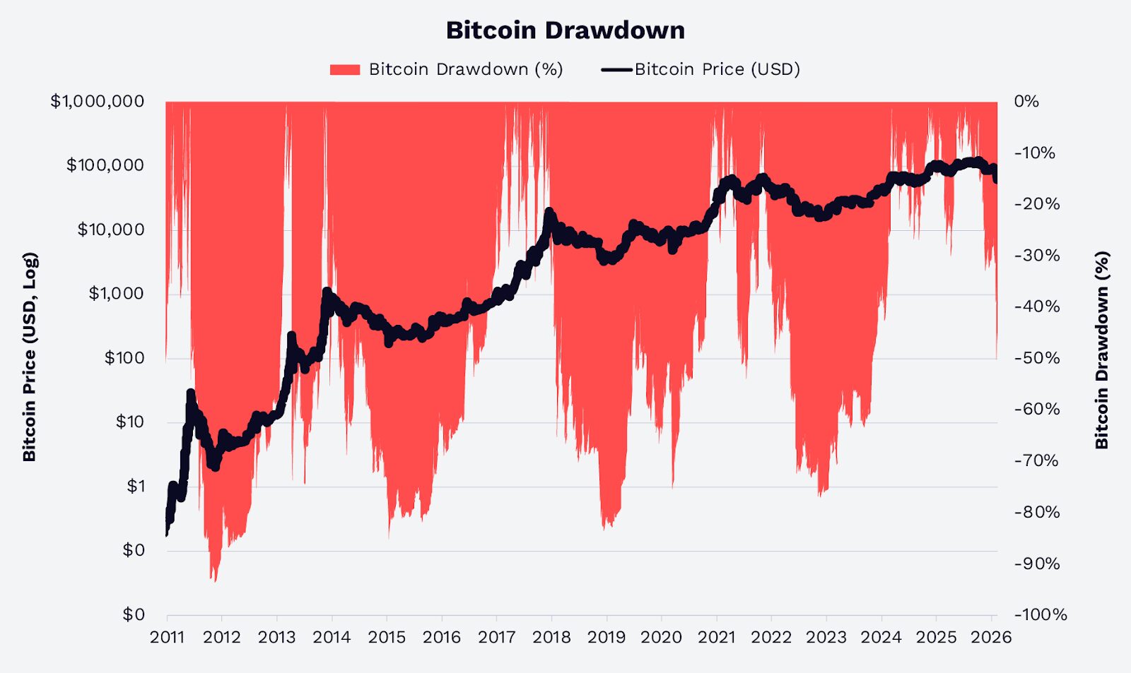 比特幣是一種波動性較大的資產,但其回撤幅度已隨時間推移而減少。在之前的周期中,從峰值到谷底的跌幅經常超過 70–80% 。在 2022 年以來的本輪週期中(截至 2026 年 2 月 8 日),從歷史最高點回落的幅度均未超過約 50%(如下圖)。這表明,即使面臨重大回檔(如 2026 年 2 月第一週發生的調整),由於參與度增加和流動性深化,市場表現得更穩健。