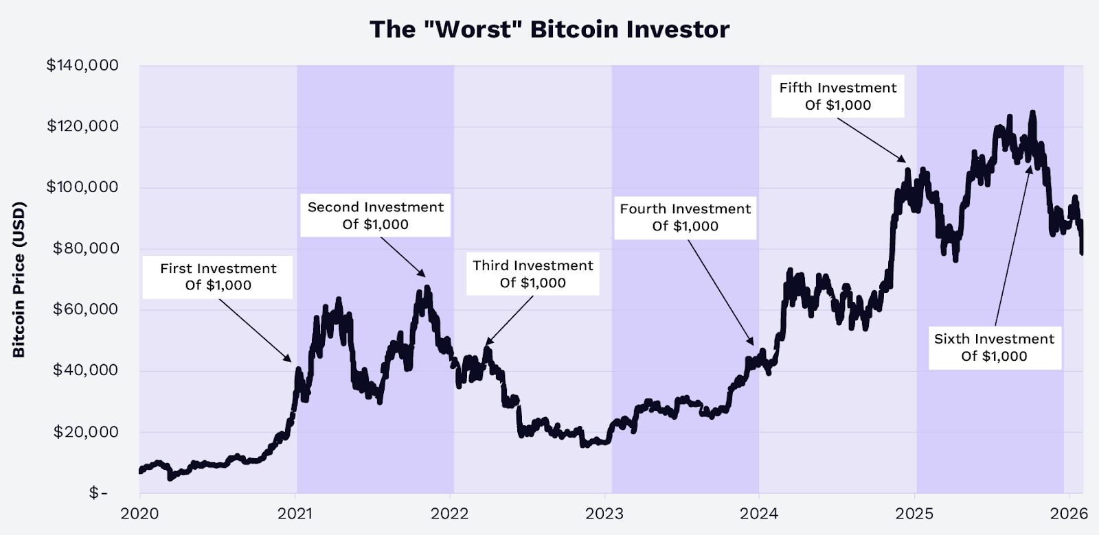 根據 Glassnode 數據,假設一位「運氣最差」的比特幣投資者,從 2020 年到 2025 年,每年都在最高價位投資 1000 美元,他的投資額約為 6000 美元,到 2025 年 12 月 31 日將增值至約 9660 美元,到 2026 年 1 月 31 日將增值至約 8,680 美元,收益率分別約為 61% 和 45%(如下圖所示)。即使考慮到 2 月初的回調,到 2 月 8 日,這筆投資將達到 7,760 美元,收益率約為 29% 。