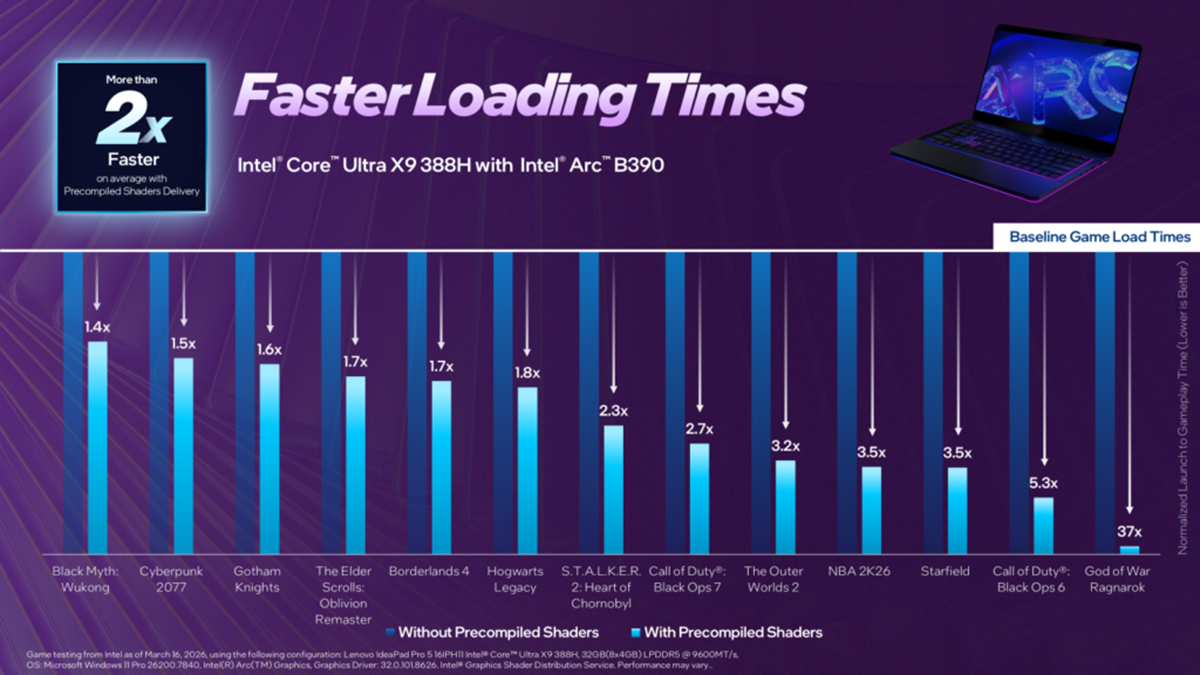 Intel強調,在省卻執行著色器編譯過程後,玩家在第一次執行遊戲可縮減1.3倍至5倍時間,此外在遊玩遊戲時也不會因為即時的著色器編譯消耗資源導致遊戲卡頓,同時史首次載入遊戲就有流暢的效能體驗。