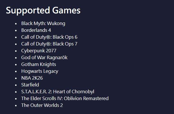 黑神話:悟空,邊緣禁地4,決戰時刻:黑色行動6,決戰時刻:黑色行動7,電馭叛客2077,戰神:諸神黃昏,高譚騎士,霍格華茲的傳承,NBA 2K26,Starfield,浩劫殺陣2:車諾比之心,上古卷軸IV:湮滅重製版與天外世界2。