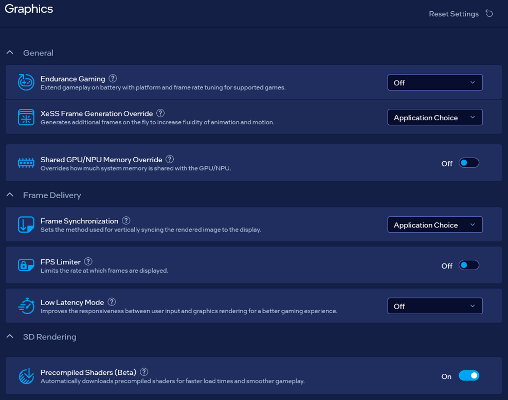 Precompiled Shaders的原理與微軟進階著色器預載相同,同樣先透過Intel的雲端基礎設施針對遊戲進行著色器編譯並產生敘述檔,當使用Arc GPU的玩家安裝支援Precompiled Shaders的遊戲時,Intel顯示卡應用程式會自動檢查並下載對應的描述檔,啟動遊戲時即可載入描述檔省卻著色器編譯的時間。